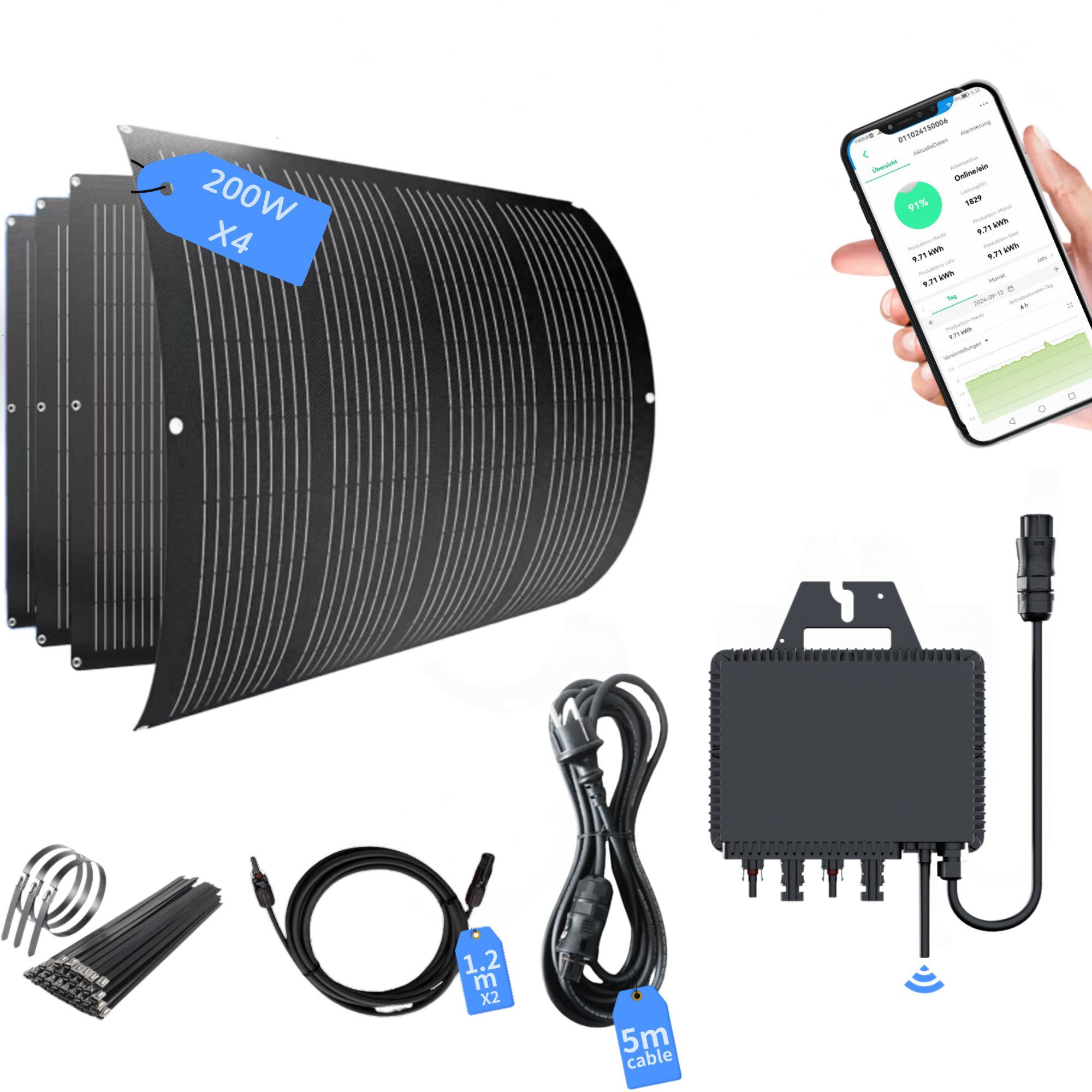 Set beinhaltet | 800 W Mikrowechselrichter, flexible Module 200 W x 4, DC Verlängerungskabel MC4 1.2M*2, 2M*2, AC-Kabel 5 m, Edelstahlband. |