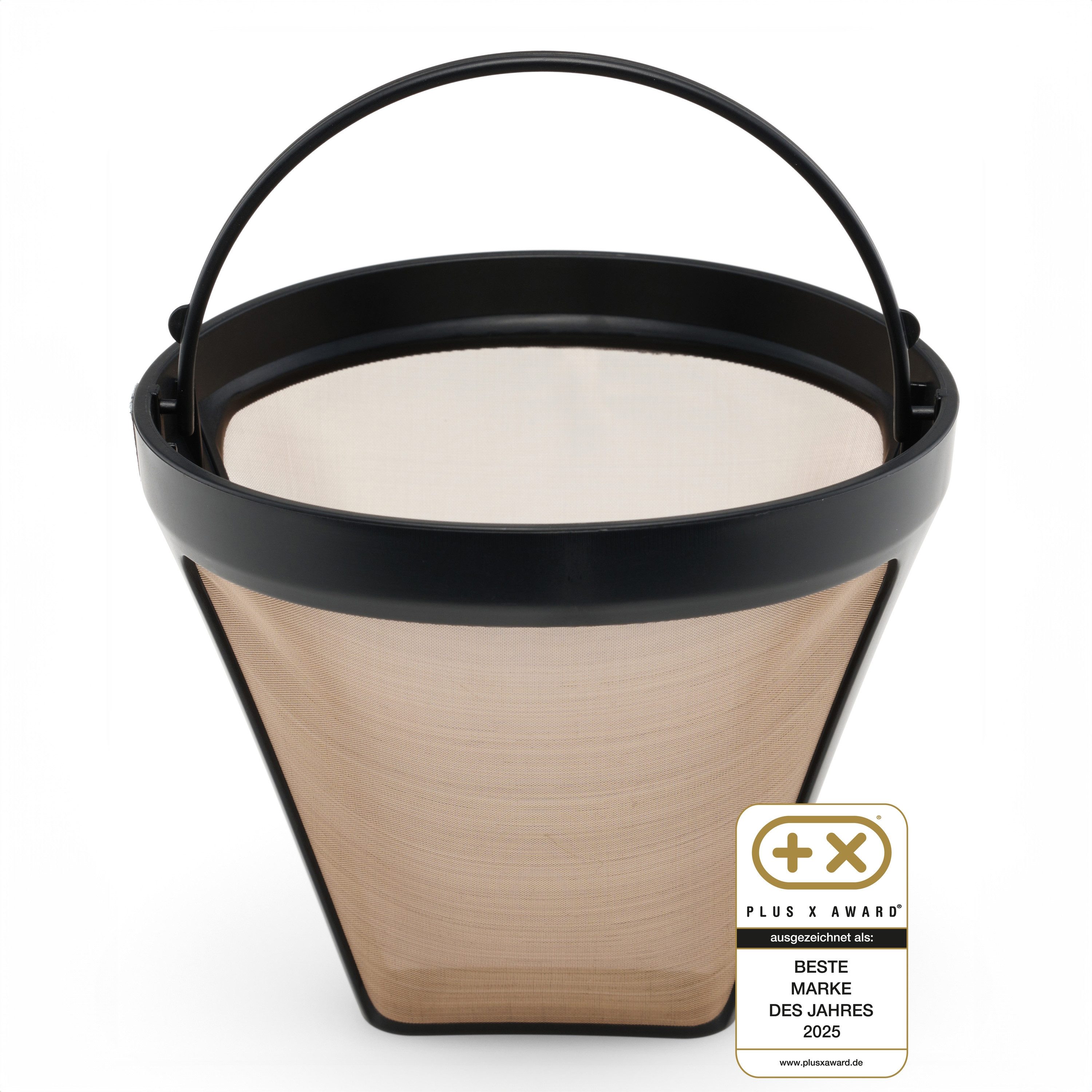 Der praktische klappbare Griff erleichtert das Einsetzen und Herausnehmen, sodass das Kaffeekochen zum Kinderspiel wird. Der goldene Dauerfilter ist robust und langlebig, sodass du ihn einfach nach jedem Gebrauch kurz ausspülen kannst. Damit sparst du nicht nur Geld, sondern vermeidest auch unnötigen Müll – eine ideale Lösung für umweltbewusste Kaffeeliebhaber.