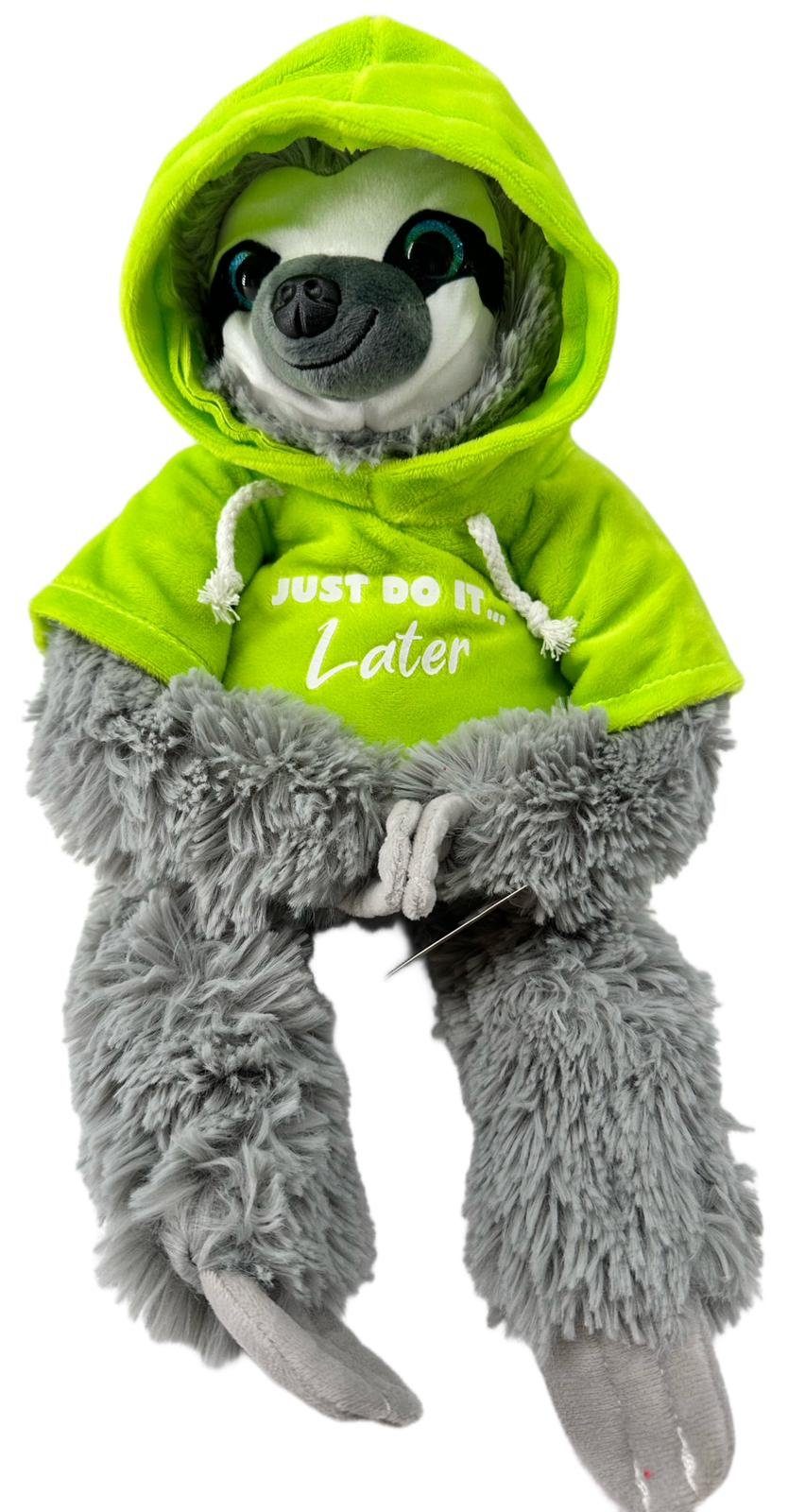 Dieses XXL Faultier trägt einen grünen Hoodie mit dem Spruch „Just do it later“. Es ist kuschelig weich, bringt Spaß ins Kinderzimmer und ist ein super Geschenk für Faultier-Fans.