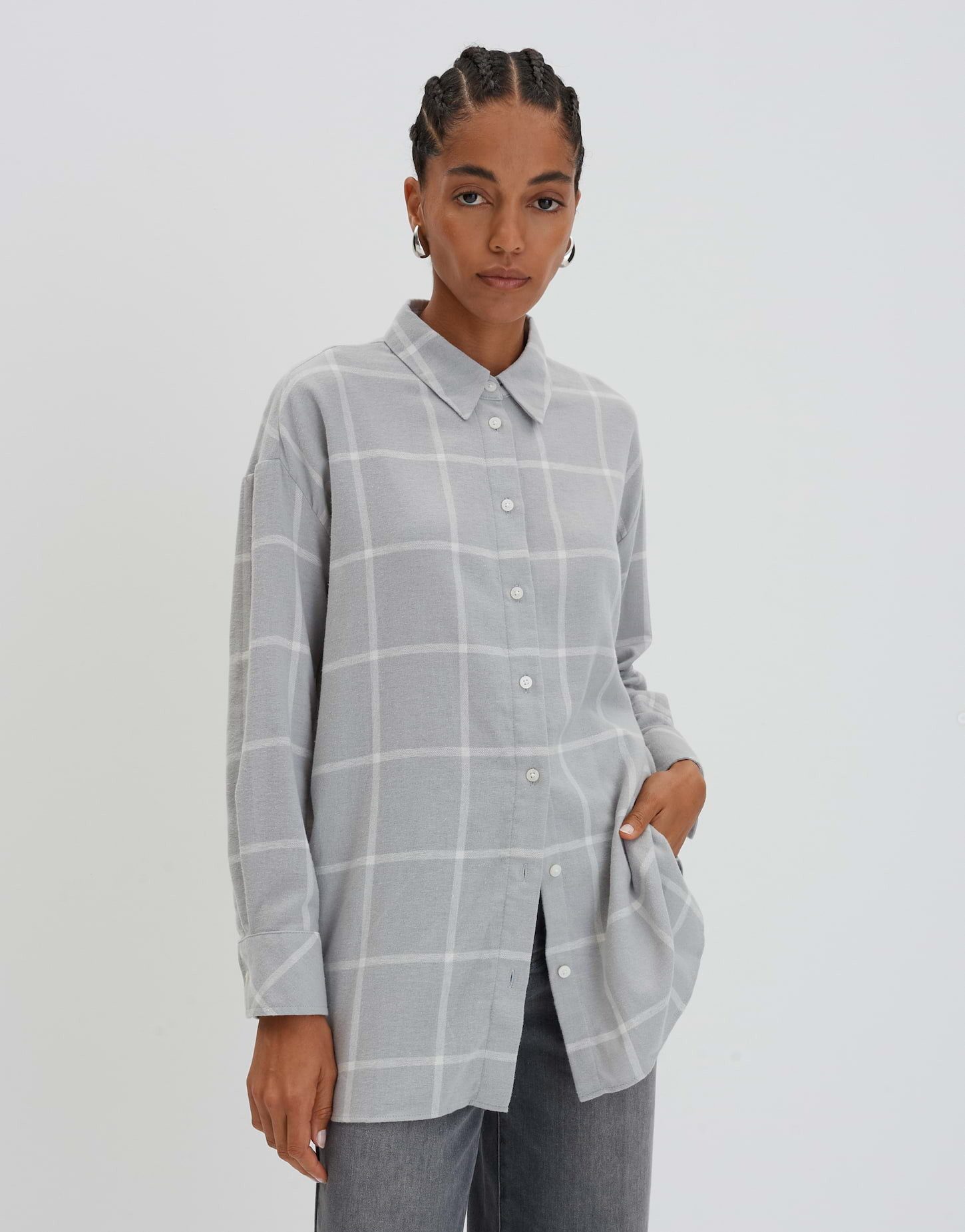 Die Hemdbluse aus einer hochwertigen BCI Cotton Qualität spielt einen großen Window Check über eine extrem softe Oberfläche. Der lässige Fit verleiht der Bluse einen kernigen Charakter und maximalen Tragekomfort.