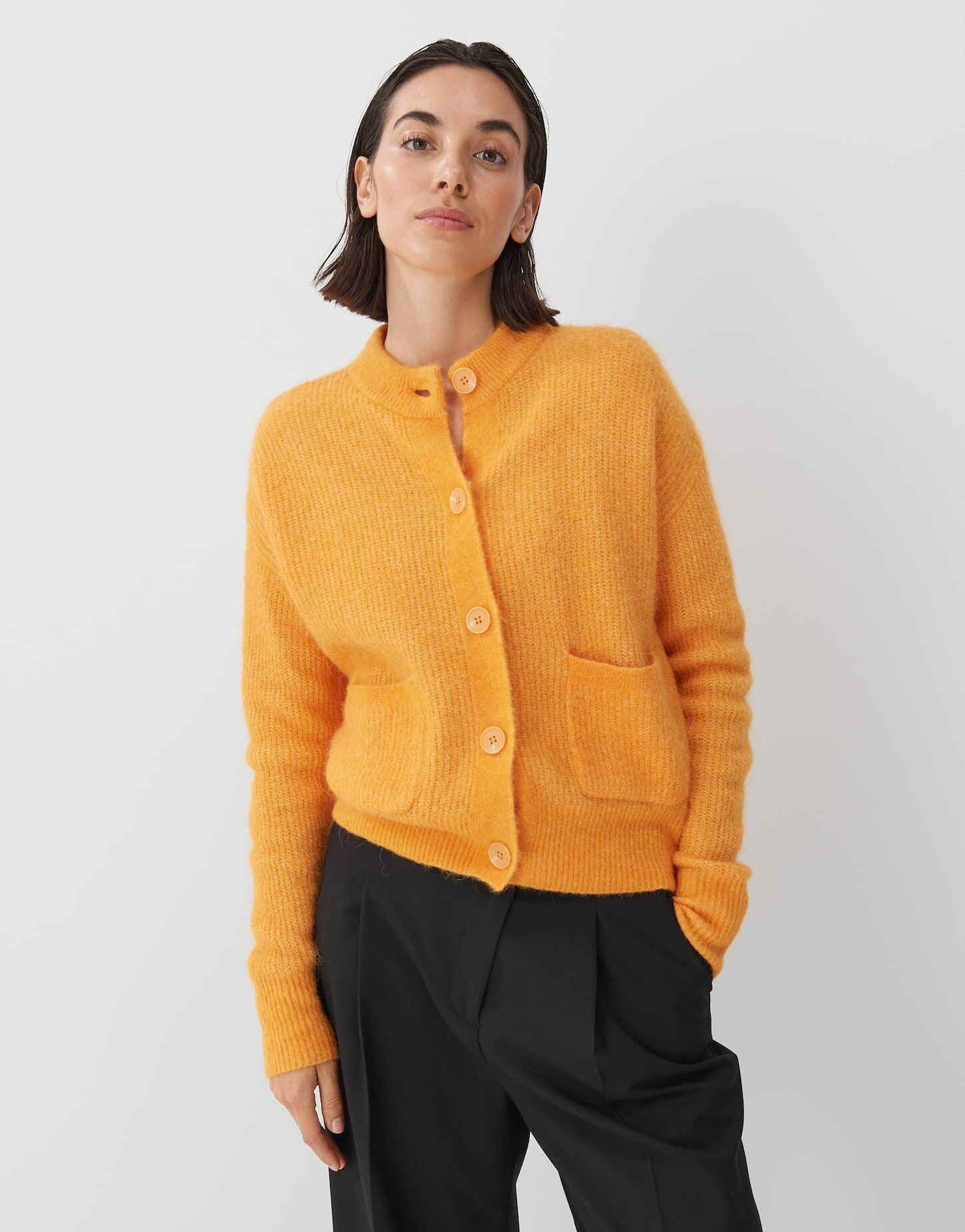 Die Strickjacke aus einem flauschigen Woll Mix verfügt über eine dynamische Rippstrick-Optik und eine schöne Melange. Der Rundhalsausschnitt ist hochgeschlossen und bietet einen klassischen Kontrast zu den lässigen Eingrifftaschen auf der Front.