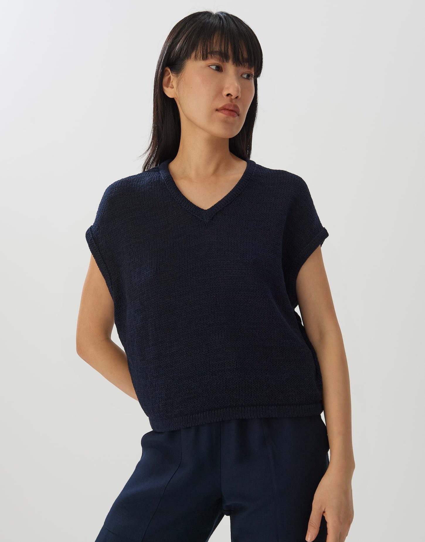 Das Strickshirt aus einem BCI Cotton Mix ist locker gestrickt und besticht mit wunderschönem Handmade Charakter. Die weite Form ist mit einem überschnittenen Kurzarm und einem femininen V-Ausschnitt versehen.