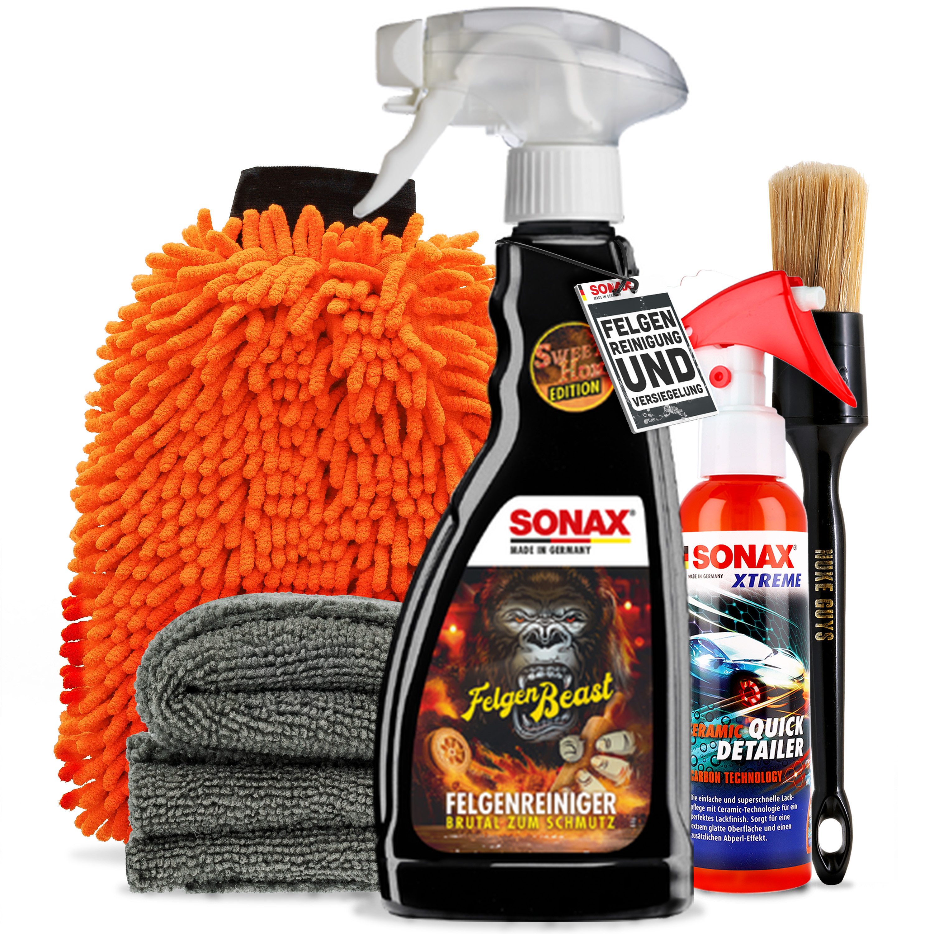 Set beinhaltet | 1x SONAX FelgenBeast Sonderedition 1x Sonax Xtreme Ceramic QuickDetailer 1x Nuke Guys Waschhandschuh 1x Nuke Guys Pinsel - Large 1x Edgeless GreyLow Mikrofasertuch grau 40x40cm 380GSM |
