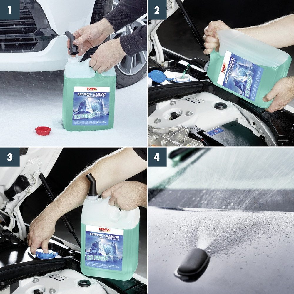 Der SONAX AntiFrost+KlarSicht bis -18°C Ice-fresh sorgt mit seinem trendigen Ice-fresh-Duft für klare Sicht im Winter.