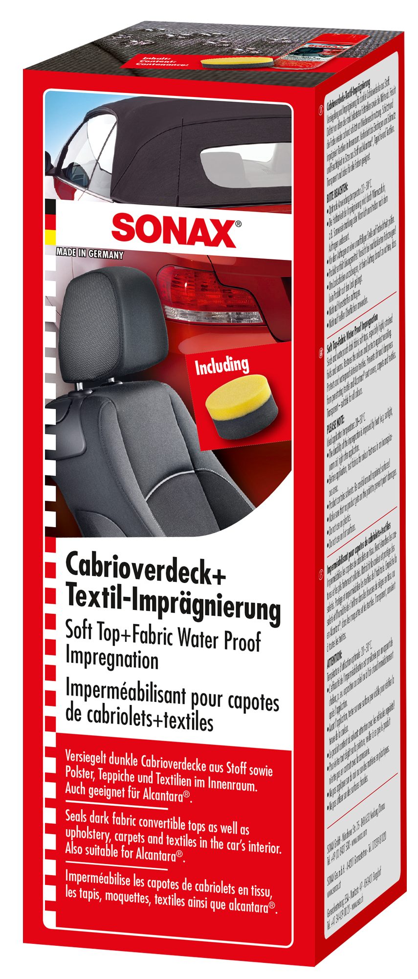 Versiegelung und Imprägnierung für Cabrioverdecke aus Stoff. Dichtet vor allem die stark belasteten Faltstellen sowie die Nähte ab. Frischt die Farbe wieder auf und schützt vor Wiederverschmutzung. Schützt und imprägniert auch Textilien im Innenraum. Verhindert das Eindringen von Schmutz und Feuchtigkeit in Sitze aus Stoff und Alcantara, Teppiche und Textilien. Transparent und daher für alle Farben geeignet. Mit praktischem Schaumspender und inklusive einem Applikationsschwamm zum sauberen und gleichmäßigen Auftragen.