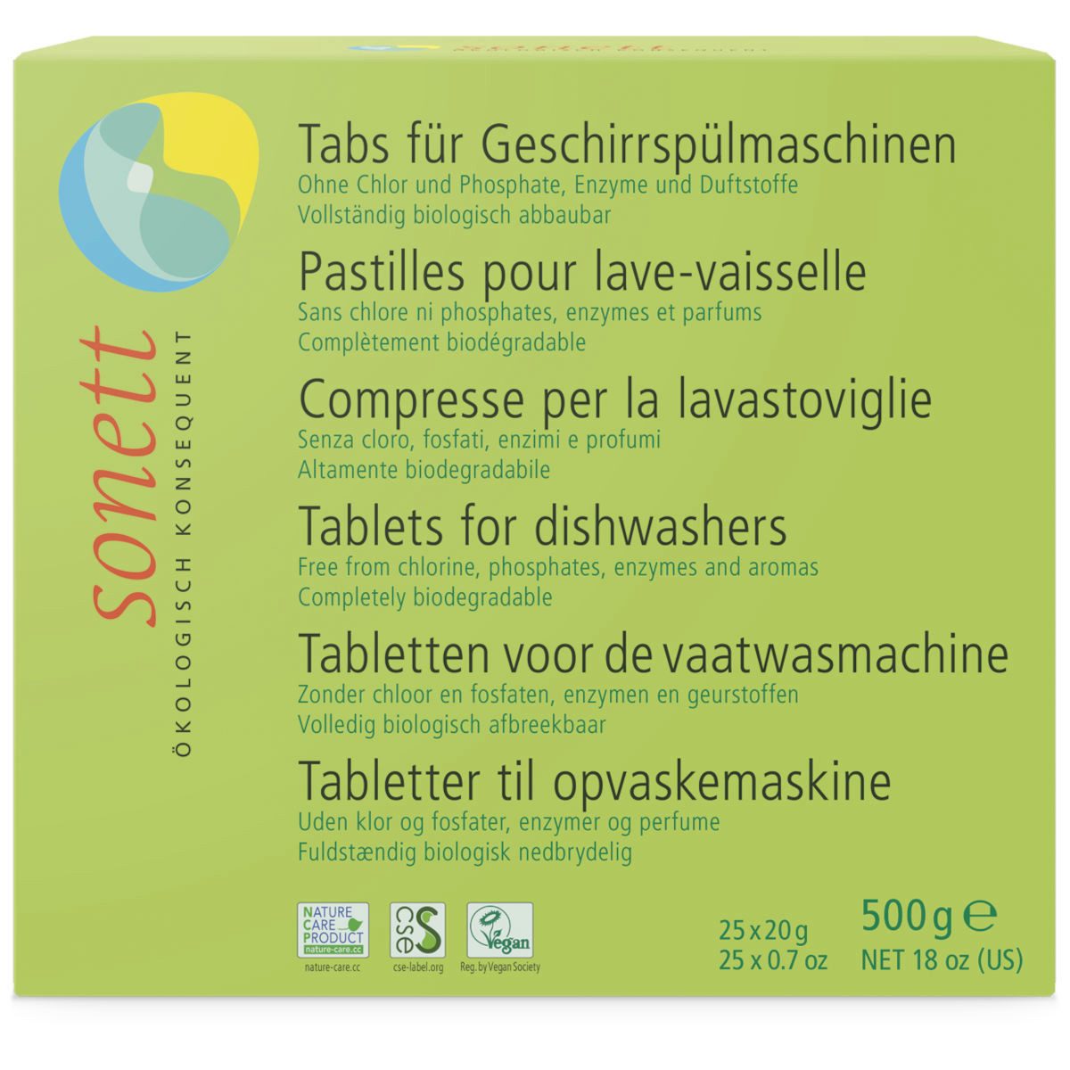Die Sonett Tabs für Geschirrspülmaschinen enthalten Mineralien und vollständig biologisch abbaubare organische Bestandteile. Sie enthalten keine Enzyme, keine aggressiven chlorhaltigen Bleichmittel, keine Phosphate und keine Duftstoffe.
