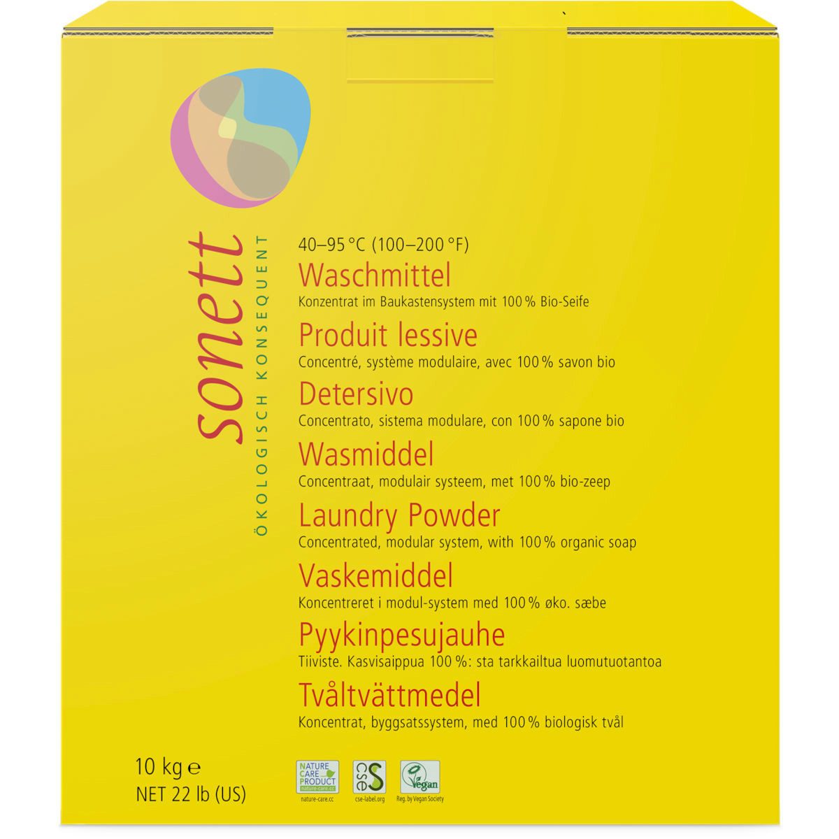 Das Sonett-Waschmittel enthält als Hauptwirkstoff Seife, die aus verschiedenen Pflanzenölen – Palmöl, Rapsöl und Kokosöl – durch Sieden mit Lauge hergestellt wird. Die Öle stammen zu 100% aus biologischem bzw. biologisch-dynamischem Anbau. Seife als waschaktive Substanz vereinigt in sich in einzigartiger Weise alle für den Waschprozess notwendigen Eigenschaften des Schmutzbenetzens, des Schmutzlösens und Schmutztragens. Soda wird hergestellt aus der Umsetzung von Kalk mit Kochsalz. Metasilikat entsteht durch Verschmelzung von Quarzsand und Soda. Soda und Metasilikat verstärken beide durch ihre Alkalität die Waschlauge und fördern das Ablösen vor allem von fettigen Substanzen. Zeolith A und Schichtsilikat haben beide als Ausgangsrohstoff Silikatgesteine. Neben ihrer Eigenschaft, den Kalk im Wasser zu binden, binden diese Substanzen zugleich auch die im Waschwasser gelösten organischen Stoffe und Farbpigmente und verhindern deren Absetzen auf der Wäsche. Fettalkoholsulfat, aus Kokosfett gewonnen, unterstützt die Seife in ihrer Fettlösekraft.