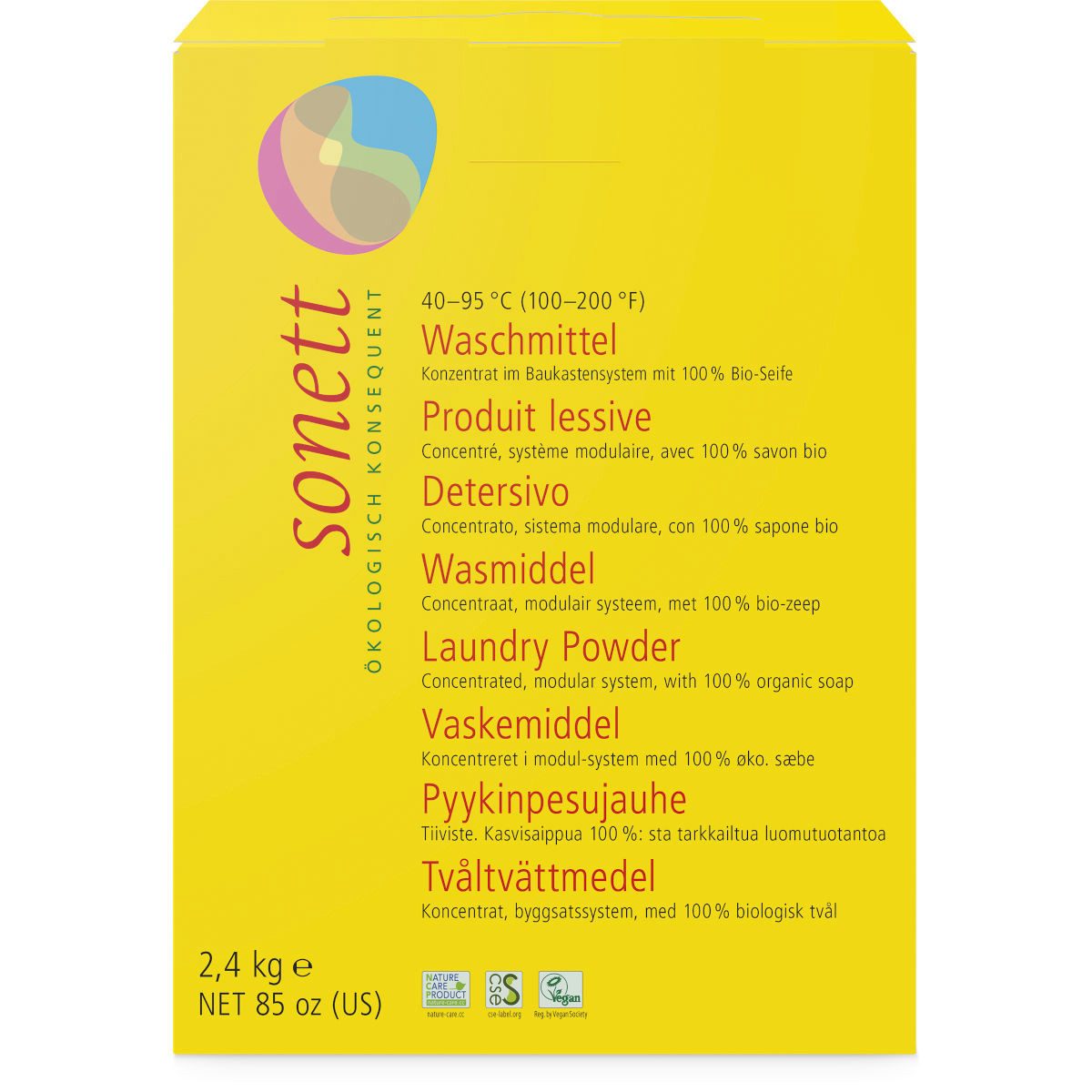 Das Sonett-Waschmittel enthält als Hauptwirkstoff Seife, die aus verschiedenen Pflanzenölen – Palmöl, Rapsöl und Kokosöl – durch Sieden mit Lauge hergestellt wird. Die Öle stammen zu 100% aus biologischem bzw. biologisch-dynamischem Anbau. Seife als waschaktive Substanz vereinigt in sich in einzigartiger Weise alle für den Waschprozess notwendigen Eigenschaften des Schmutzbenetzens, des Schmutzlösens und Schmutztragens. Soda wird hergestellt aus der Umsetzung von Kalk mit Kochsalz. Metasilikat entsteht durch Verschmelzung von Quarzsand und Soda. Soda und Metasilikat verstärken beide durch ihre Alkalität die Waschlauge und fördern das Ablösen vor allem von fettigen Substanzen. Zeolith A und Schichtsilikat haben beide als Ausgangsrohstoff Silikatgesteine. Neben ihrer Eigenschaft, den Kalk im Wasser zu binden, binden diese Substanzen zugleich auch die im Waschwasser gelösten organischen Stoffe und Farbpigmente und verhindern deren Absetzen auf der Wäsche. Fettalkoholsulfat, aus Kokosfett gewonnen, unterstützt die Seife in ihrer Fettlösekraft.