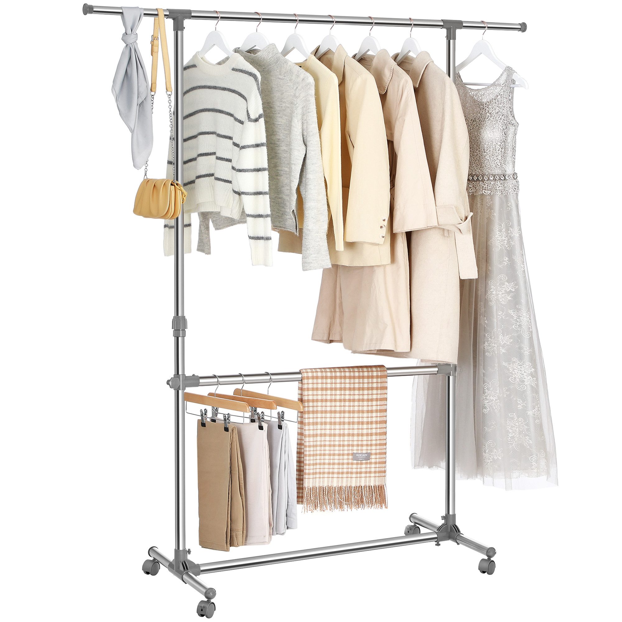 Shoppen Sie für Ihr Leben gern oder müssen Sie beruflich über zahlreiche Arbeitsoutfits verfügen? Kein Problem. Diese Garderobenstange besitzt gleich 2 unterschiedlich hoch angeordnete Kleiderstangen. Diese sind jeweils mit bis zu 25 kg belastbar. Die obere Stange lässt sich zudem ausziehen. Beide Stangen sind ferner höhenverstellbar. Ein Maximum an Flexibilität für Ihre Kleidersammlung.