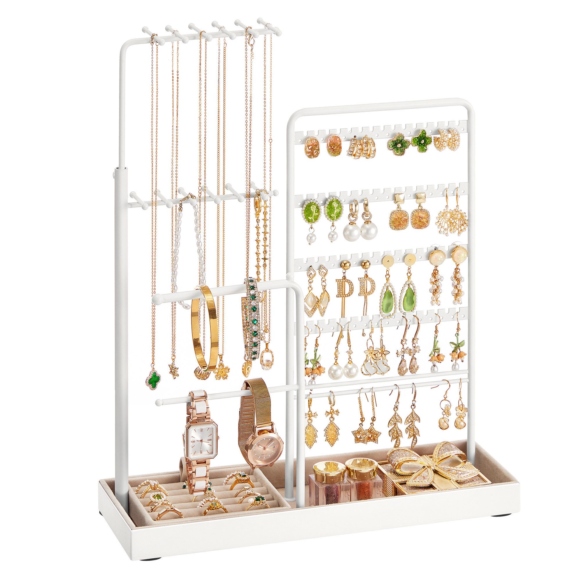 3 Rahmen mit großem Abstand, mehrere Löcher und Schlitzen sorgen dafür, dass Ketten, Ohrringe und Armbänder übersichtlich und ohne Verheddern aufgehängt werden können. Das Tablett unten bietet zusätzlichen Platz für Ringe und kleine Accessoires.