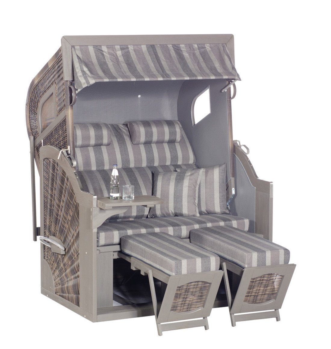 „Seitlicher Ausblick im Strandkorb“. Der Garten-Strandkorb »Rustikal 405 Z Comfort XL« ist die Neuheit aus dem SunnySmart-Strandkorbprogramm. Neu gestaltete, fest integrierte Fenster aus Acrylglas ermöglichen den seitlichen Ausblick beim Verweilen im eigenen Garten-Strandkorb. Die beliebte klassische Ostseeform bietet zudem bei diesem Modell auch annähernden Liegekomfort. Die Top-Ausstattung mit einer sehr bequemen herausnehmbaren Kissengarnitur, einem großen Bistrotisch, 2 Nackenrollen, 2 Kuschelkissen, 2 Fußkissen sowie die verlängerbaren und höhenverstellbaren Fußstützen unterstreichen die Besonderheit des Strandkorbs. Durch die Verwendung von gebürstetem Pinienholz erhält dieser Strandkorb zudem eine einzigartige Optik. Der sehr gut kartonverpackte Strandkorb mit den vorgefertigten Komponenten ermöglicht selbst Ungeübten anhand der mitgelieferten Aufbauanleitung eine zügige und unkomplizierte Montage.
