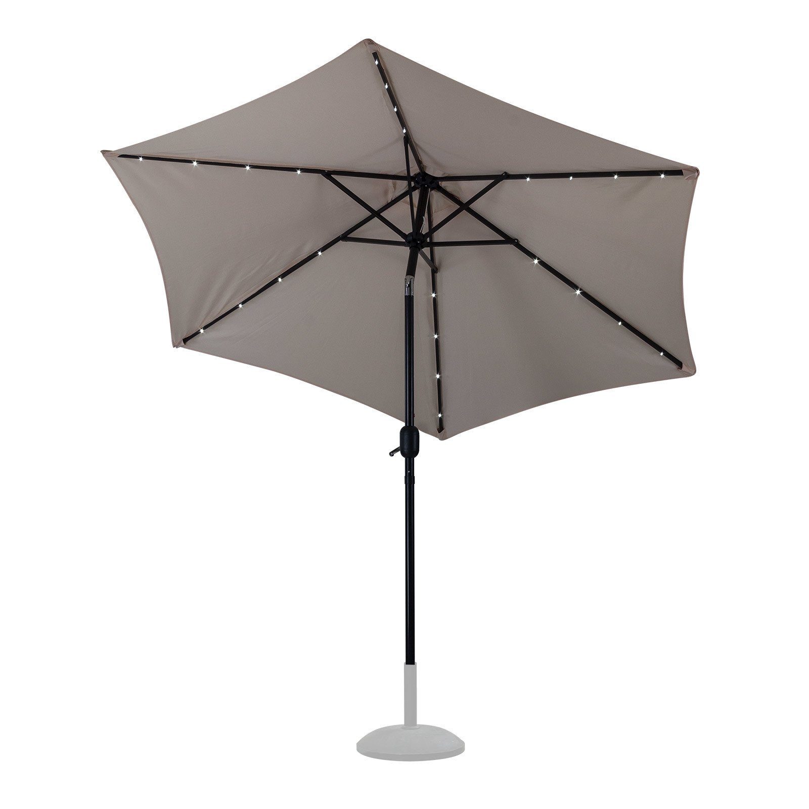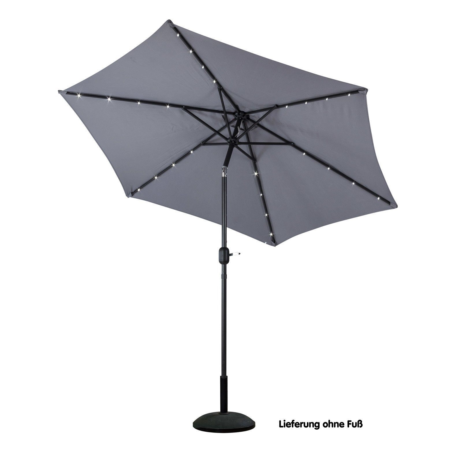 Sehr schöner Garten-Sonnenschirm mit 2,70 Meter Durchmesser und effektvoller LED Beleuchtung. Da macht das Feiern oder Relaxen gleich doppelt so viel Freude. Und das Sie auch noch draußen sitzen können, wenn die Sonne schon längst untergegangen ist, sind in den Streben insgesamt 24 LED Lämpchen verbaut, welche Ihnen dann - auf Knopfdruck - eine super Atmosphäre zaubern. Sämtliche tragenden Teile sind aus Metall gefertigt und hochwertig einbrennlackiert. Die Kurbel ermöglicht eine leichte Bedienung ohne großen Kraftaufwand. Der Schirm ist kippbar und in zwei Farben erhältlich. Ein toller Schirm zu einem tollen Preis. Ausstattung 6 Schirmspeichen mit je 4 LED Lämpchen Separater Ein-Aus-Wippschalter Obenliegendes Solarpanel mit integrierten Akkus UV-beständige Bespannung aus Polyester (nicht regendicht) Hochwertiges Metallgerüst Mit First-Entlüftung Verbindung der Hauptrohre über Steck-Klipp-Funktion Kurbelbedienung mit Seilzug zum Öffnen und Спрятать Schirmoberteil neigbar Lieferung erfolgt komplett montiert (lediglich das Solarpanel-Gehäuse muss noch mit dem Schirm verbunden werden) Technische Daten Schirmdurchmesser: 270 cm Durchlaufhöhe: 202 cm Rohr/Gestänge: Ø 38 mm Stoff aus Polyester, wasserabweisend 24 LED Lämpchen Leistung Solarpanel: 1,6 Watt Leuchtfarbe: Reinweiß Solarpanel 12x12 cm 2 Stück leicht auswechselbare Ni-Mh AA 1500 mAh Akkus inklusive Gesamthöhe: 237 cm Gewicht: 6,42 kg