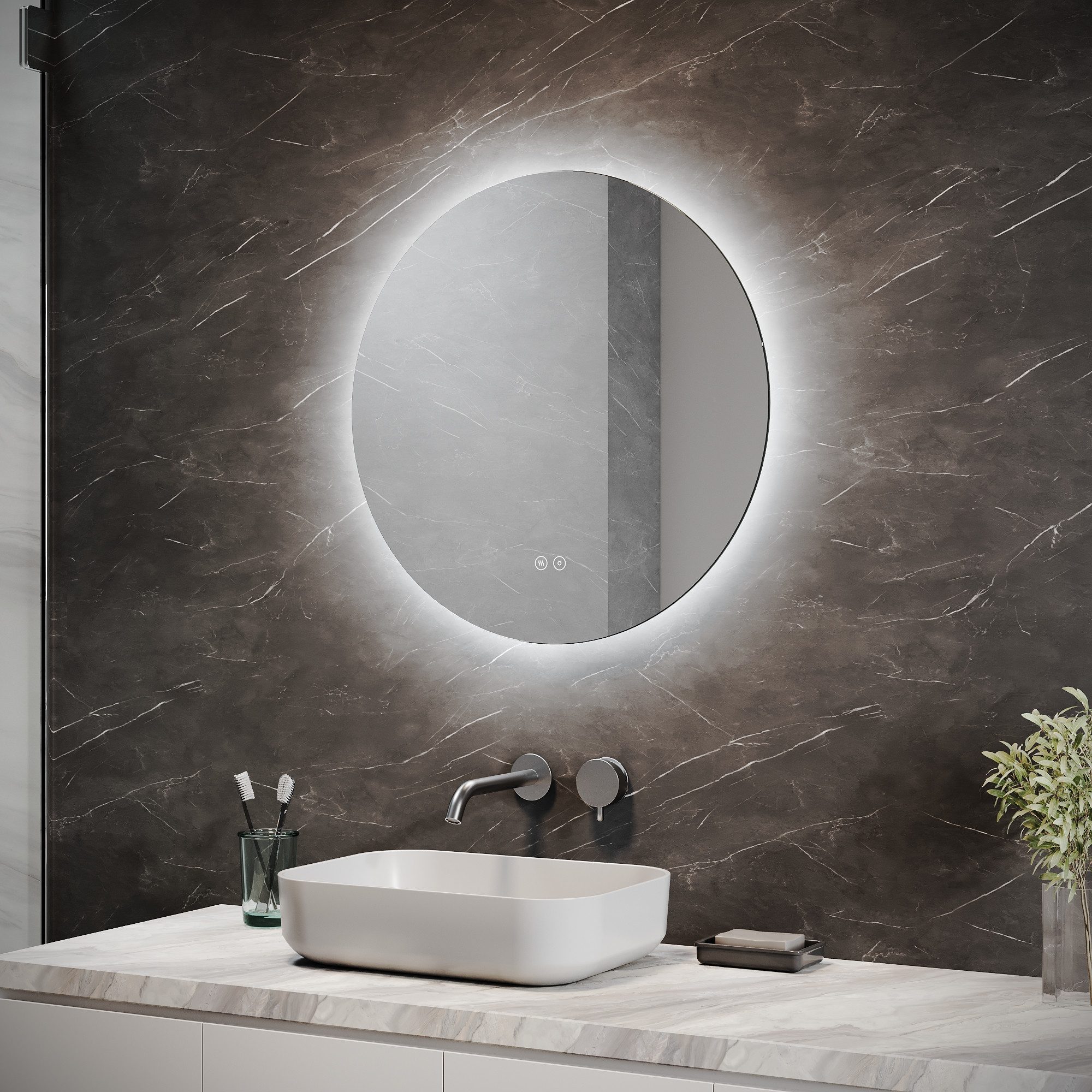 Berührungsschalter : Die Beleuchtungs- und Beschlagsentfernungsfunktionen werden über zwei Berührungsschalter gesteuert. Hochwertiger Aluminiumrahmen : Unser Badezimmerspiegel ist mit einem stabilen versilberten Aluminiumrahmen mit einem 4 mm starken umweltfreundlichen Spiegel ausgestattet. Diese robuste Konstruktion verhindert das Verbiegen des Rahmens und ist umweltfreundlicher und kratzfest.
