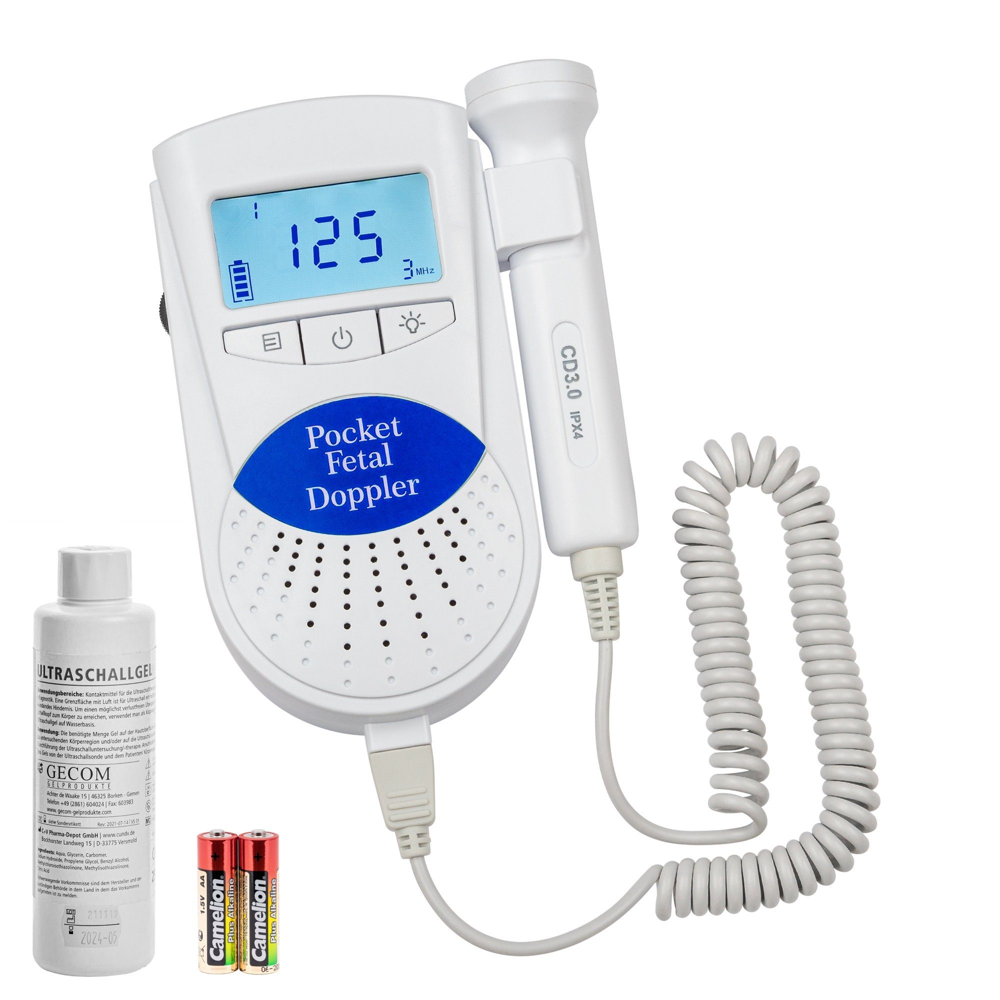 Lieferumfang | Fetal-Doppler, Batterien, Sonde, Ultraschallgel, Bedienungsanleitung |