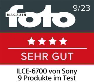 Das „fotoMAGAZIN“ testet die Sony Alpha 6700 im Vergleich mit acht weiteren APS-C Kameras von Fujifilm und Sony. Die Kamera bietet eine hohe Bildqualität. Auch die sehr hohe Geschwindigkeit überzeugt. Außerdem punkten die umfangreiche Ausstattung und die sehr einfache Bedienung. Mit der Gesamtwertung „SEHR GUT (83,9 %)“ gehört das Modell zum Mittelfeld des starken Testspektrums.