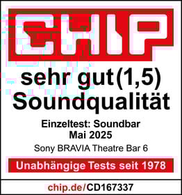 Das Onlinemagazin „CHIP.de“ testet die Sony Bravia Theatre Bar 6 im Einzeltest. Die „sehr gute (1,5)“ Soundqualität ist „rundum solide“ und „satt“. Auch der Raumklang ist „gelungen“. Zwar gibt es „wenige analoge Schnittstellen“. Aber insgesamt ist die Ausstattung sehr solide. Außerdem punkten die „einfache App und Fernbedienung“. Die Soundbar erhält die „CHIP“-Note „gut (2,2)“.