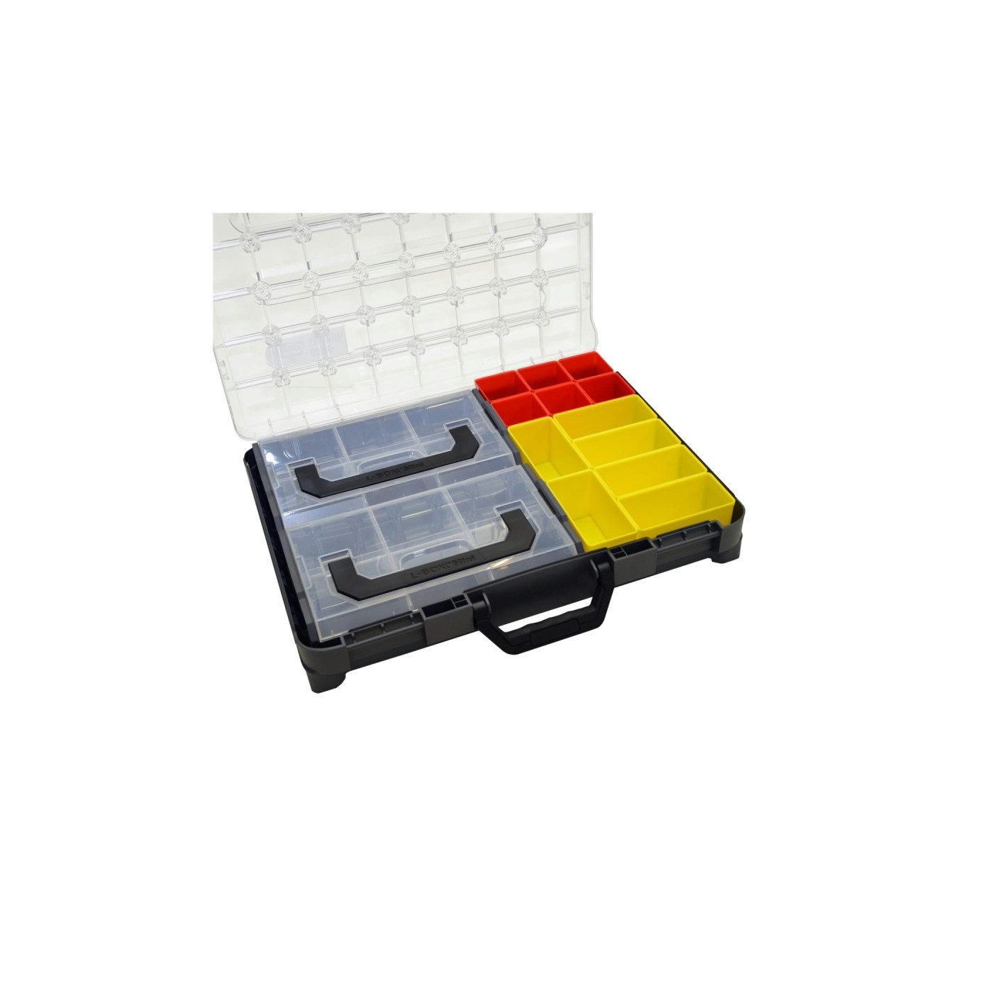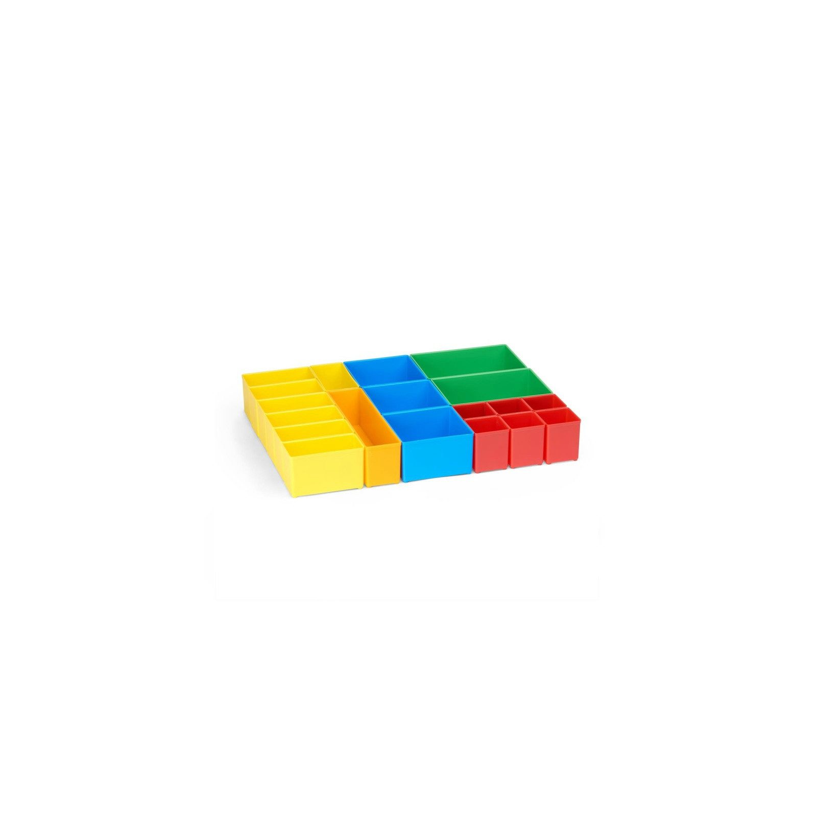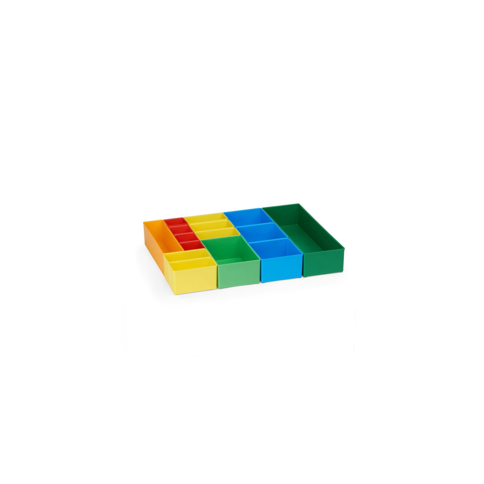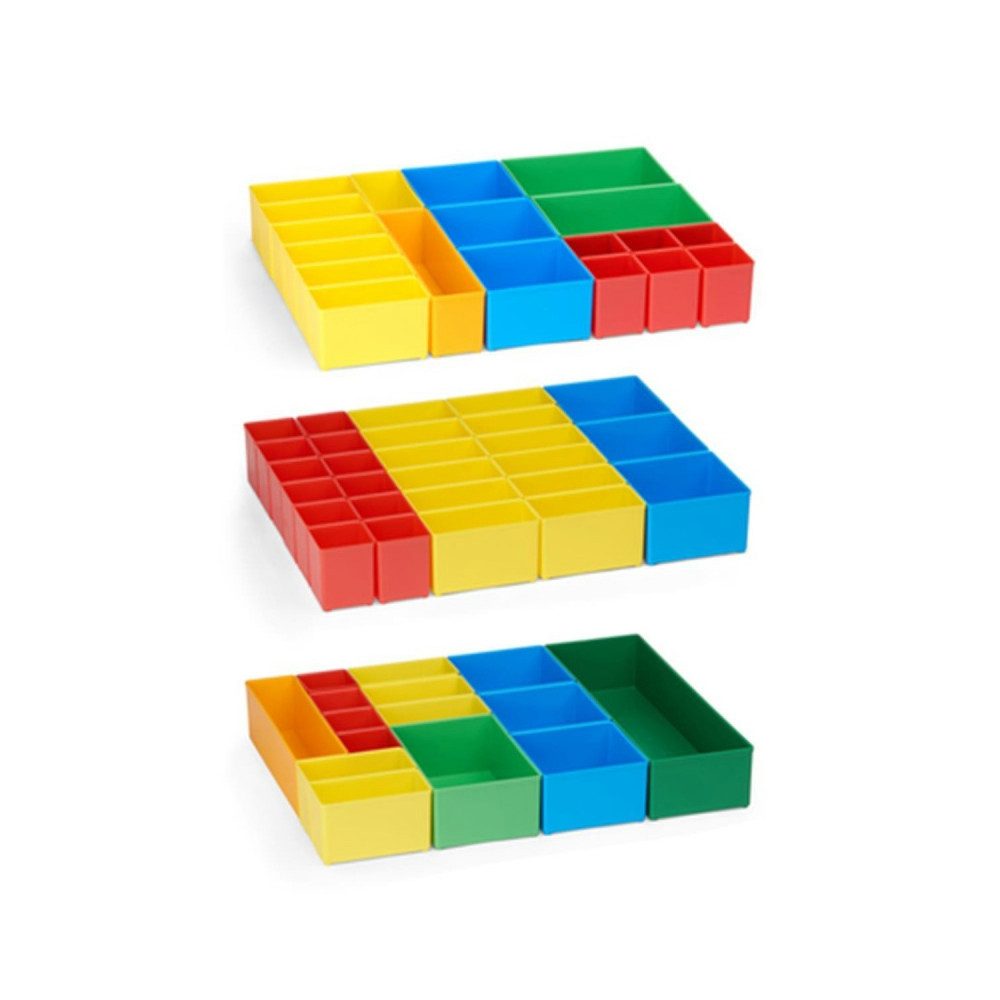 Bosch Sortimo Insetboxen-Set TRADE 1/2/3/WZ für T-Boxx A. 1 x Insetboxen Set Trade 1 (12 x Insetbox A3 Rot ; 12 x Insetbox B3 Gelb ; 3 x Insetbox C3 Blau) B. 1 x Insetboxen Set Trade 2 (6 x Insetbox A3 Rot ; 7 x Insetbox B3 Gelb ; 3 x Insetbox C3 Blau ; 2 x Insetbox D3 Grün ; 1 x Insetbox F3 Orange) C. 1 x Insetboxen Set Trade 3 (4 x Insetbox A3 Rot ; 5 x Insetbox B3 Gelb ; 3 x Insetbox C3 Blau ; 1 x Insetbox D3 Grün ; 1 x Insetbox F3 Orange ; 1 x Insetbox G3 Dunkelgrün) D. 1 x Insetboxen Set WZ(6 x Insetbox A3 Rot ; 6 x Insetbox B3 Gelb ; 2 x L-Boxx Mini anthrazit) Überblick: Rascher Überblick über Kleinteile Всеs griffbereit Einzeln entnehmbar Optional beschriftbar Zeit und Nerven sparen T für Transparenz: Der transparente Deckel sorgt für eine schnelle Übersicht über Ihre Kleinteile. Durch die verschiedenen Insetboxen und Insetboxensets lässt sich die T-BOXX G ganz speziell an Ihren persönlichen Bedarf anpassen. Insetboxen: Die vielseitigen Insetboxen dienen zur Feinunterteilung der T-BOXX und lassen sich individuell nach Anwendungszweck zusammenstellen. Die Farbcodierung sorgt für einen schnellen Überblick über die verschiedenen Größen, welche zudem mit den übrigen Komponenten aus dem L-BOXX System kompatibel sind. Der transparente Deckel des Менюskoffers wurde so konstruiert, dass die Insetboxen in jeder Kombination bündig mit dem Deckel abschließen. Ein Vermischen der Inhalte beim Transport wird so effektiv verhindert.