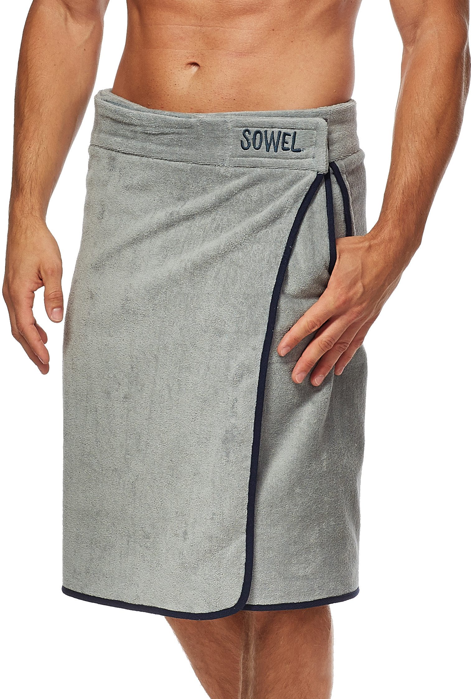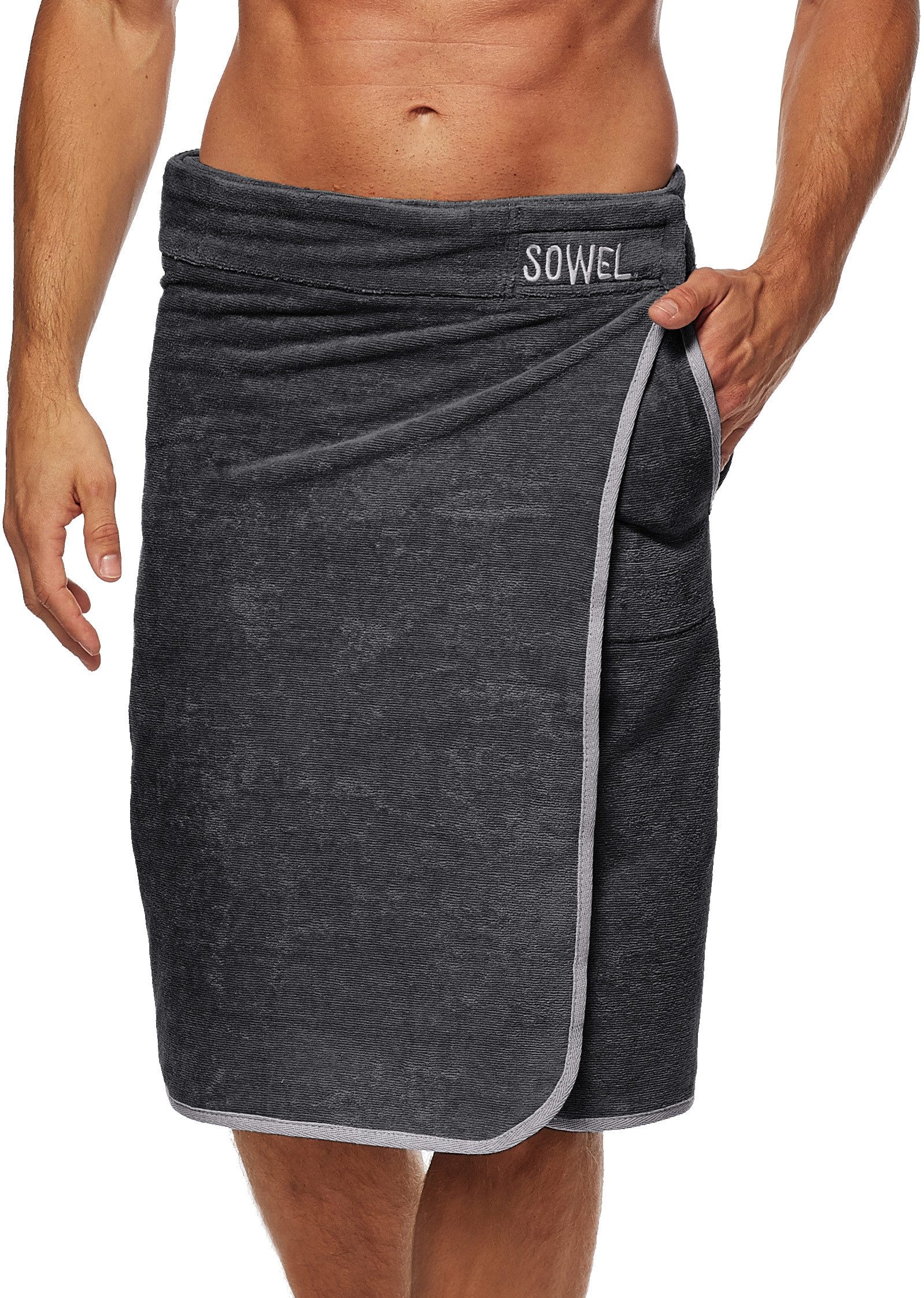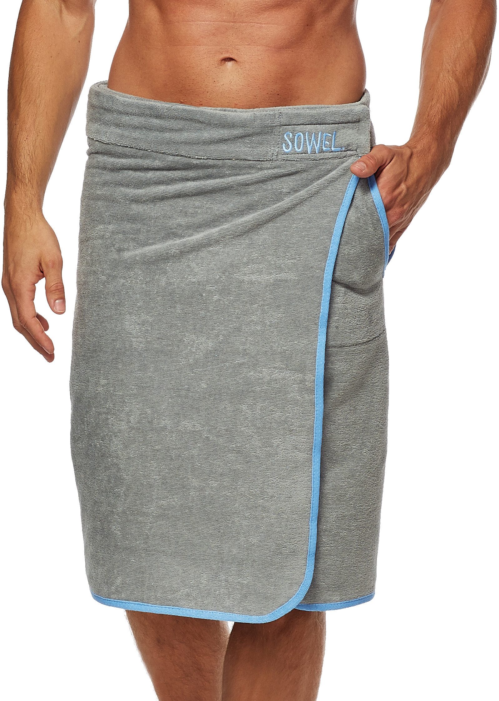 Der Saunakilt für Herren ist der perfekte Saunabegleiter Saunagänge sind gesund und erholsam. Gönnen Sie sich nach dem Sport, nach einem harten Arbeitstag oder einfach am Wochenende einen entspannten Saunagang. Mit dem hochwertigen Saunakilt für Herren gehört die ewige Sorge, dass sich das um die Hüften geknotete Handtuch lösen könnte, der Vergangenheit an. Ein stabiler Klettverschluss hält den Saunakilt mit den Maßen 60 x 140 cm zuverlässig an Ort und Stelle und macht ihn gleichzeitig sehr flexibel. Dank der geheimen Reißverschlusstasche am Bund haben Sie Schrankschlüssel, Handy oder Kleingeld immer schnell zur Hand. Das praktische Saunahandtuch für Männer verfügt über eine saugstarke Frottee-Innenseite und eine kuschelige Velours-Außenseite. Für hygienische Frische und Sauberkeit geben Sie den Saunakilt einfach bei 40 °C in die Waschmaschine und trocknen ihn anschließend bei niedriger Temperatur im Trockner. Geprüfte Qualität aus fairem Handel, hergestellt in Portugal Ein besonderes Merkmal der Marke Sowel sind die farblich abgesetzten Bordüren. Ohne den edlen Charakter der Frotteewaren zu beeinflussen, bilden diese einen Kontrast. Produziert in Portugal, fair gehandelt, stehen die hochwertigen Strand- und Saunatextilien, darunter der Saunakilt für Herren, für beste Produkteigenschaften und höchsten Komfort.