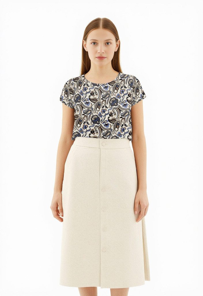 Die Kurzarmbluse von soyaconcept ist eine unkomplizierte Antwort auf die Frage "Was ziehe ich bloß zum Business-Meeting an?". Durch den Aufdruck wirkt sie sowohl locker als auch frisch. Diese Bluse hat einen Rundhalsausschnitt und ist normal. Das Oberteil hat einen Vokuhila-Schnitt und ist daher hinten länger geschnitten als vorne.