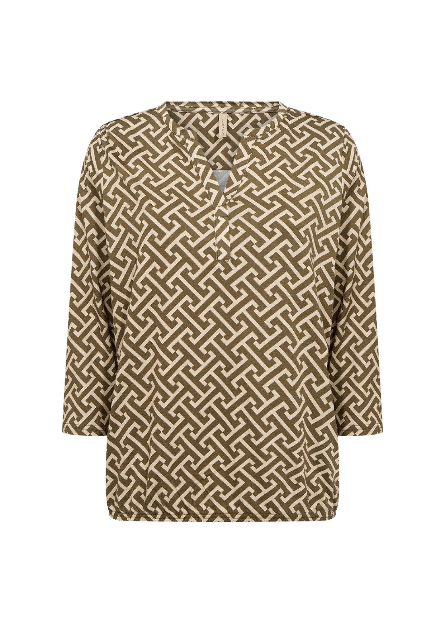 Die Bluse ist in einem wunderschönen dunklen Olivgrün gehalten, das perfekt zu den Herbstfarben passt. Sie verfügt über einen V-Ausschnitt und 3/4 Ärmel, die für einen femininen Look sorgen. Das Muster in Grafikoptik verleiht der Bluse das gewisse Etwas und macht sie zu einem echten Hingucker.