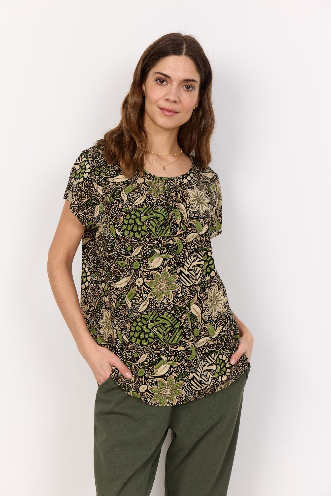 Gesucht und gefunden: Schau dir die Shirtbluse von soyaconcept mal genauer an. Diese Bluse hat einen Rundhalsausschnitt und ist hüftbedeckend.