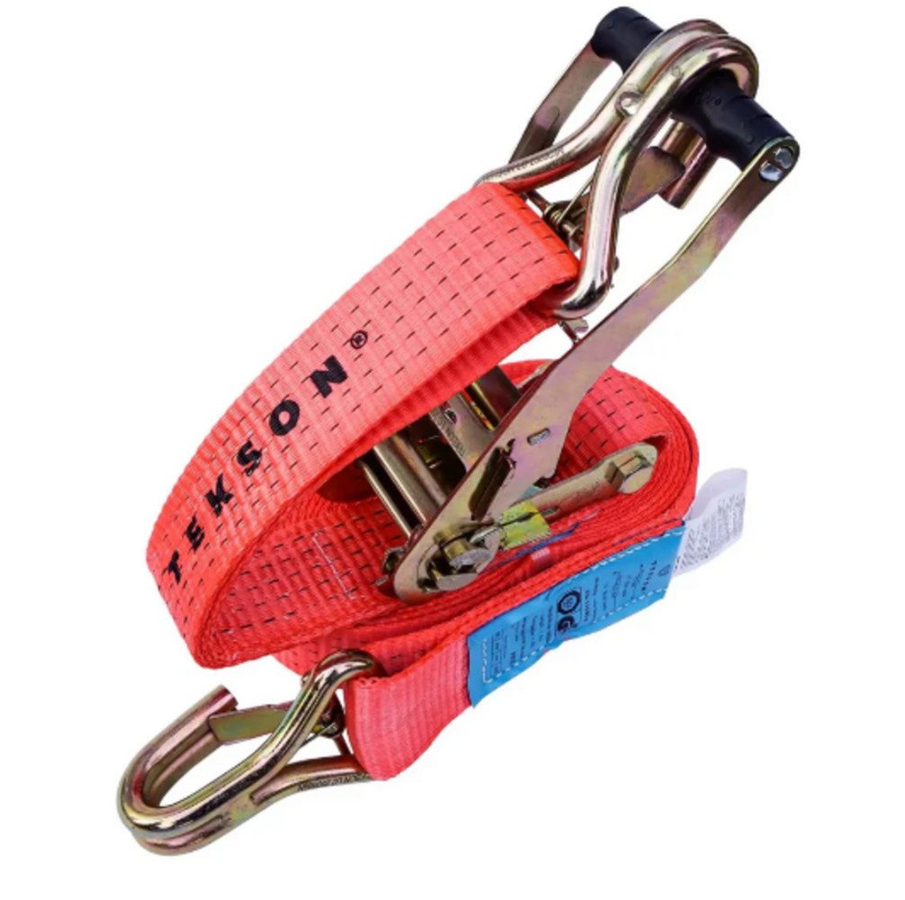 Der Tekson Spanngurt ist ein zuverlässiges Sicherungsmittel für unterschiedlichste Transportaufgaben. Mit einer LC von 2500 daN bietet er eine hohe Spannkraft und sorgt für eine sichere Ladungssicherung. Das Set ist mit einer Zugratsche ausgestattet, die eine komfortable Handhabung ermöglicht. Zudem verfügt der Spanngurt über Doppel-J-Haken mit Riegel, die für einen festen Halt sorgen. Das Modell STF500 daN Ergo überzeugt durch seine robuste Verarbeitung und Langlebigkeit. Mit einer Длина von 9,5 Metern ist der Gurt vielseitig einsetzbar. Wichtig zu beachten: Dieser Spanngurt ist ausschließlich zur Befestigung geeignet und nicht für Hebevorgänge vorgesehen.