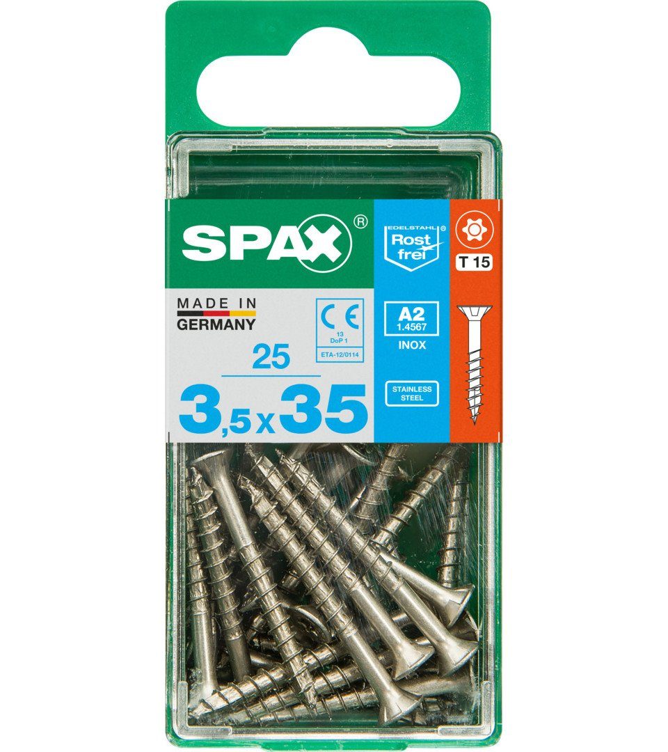 Produktdetails: Maße: 3.5 x 35 mm | Antrieb: TX 15 | Inhalt: 25 Stück | Kopfart: Senkkopf | Gewinde: Teilgewinde | Material: Edelstahl Rostfrei A2 | Einsatz: Außenanwendungen - direkt bewittert | Art der Spitze: 4CUT (kein Vorbohren nötig) | Die SPAX Edelstahl rostfrei bietet Sicherheit gegen Korrosion! |