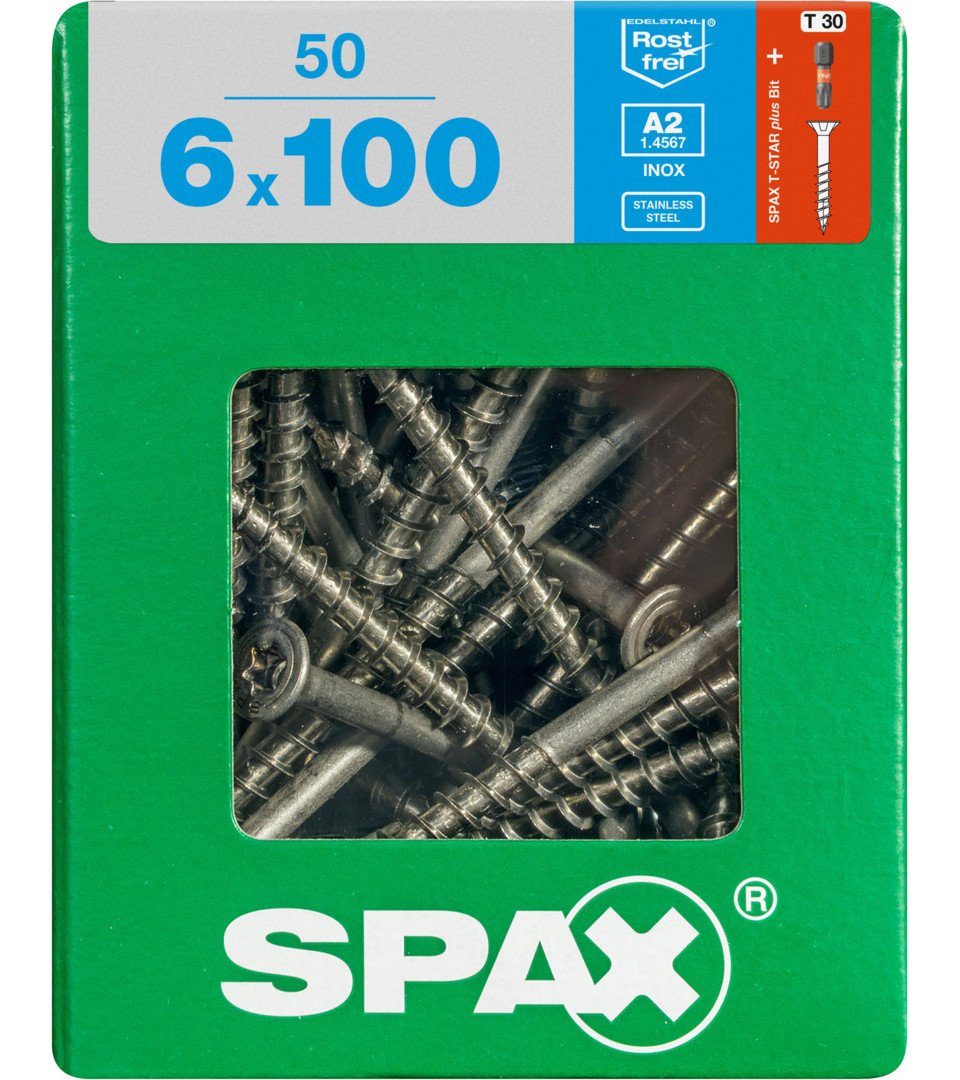 Produktdetails: Maße: 6.0 x 100 mm | Antrieb: TX 30 | Inhalt: 50 Stück | Kopfart: Senkkopf | Gewinde: Teilgewinde | Material: Edelstahl Rostfrei A2 | Einsatz: Außenanwendungen - direkt bewittert | Art der Spitze: 4CUT (kein Vorbohren nötig) | Die SPAX Edelstahl rostfrei bietet Sicherheit gegen Korrosion! |