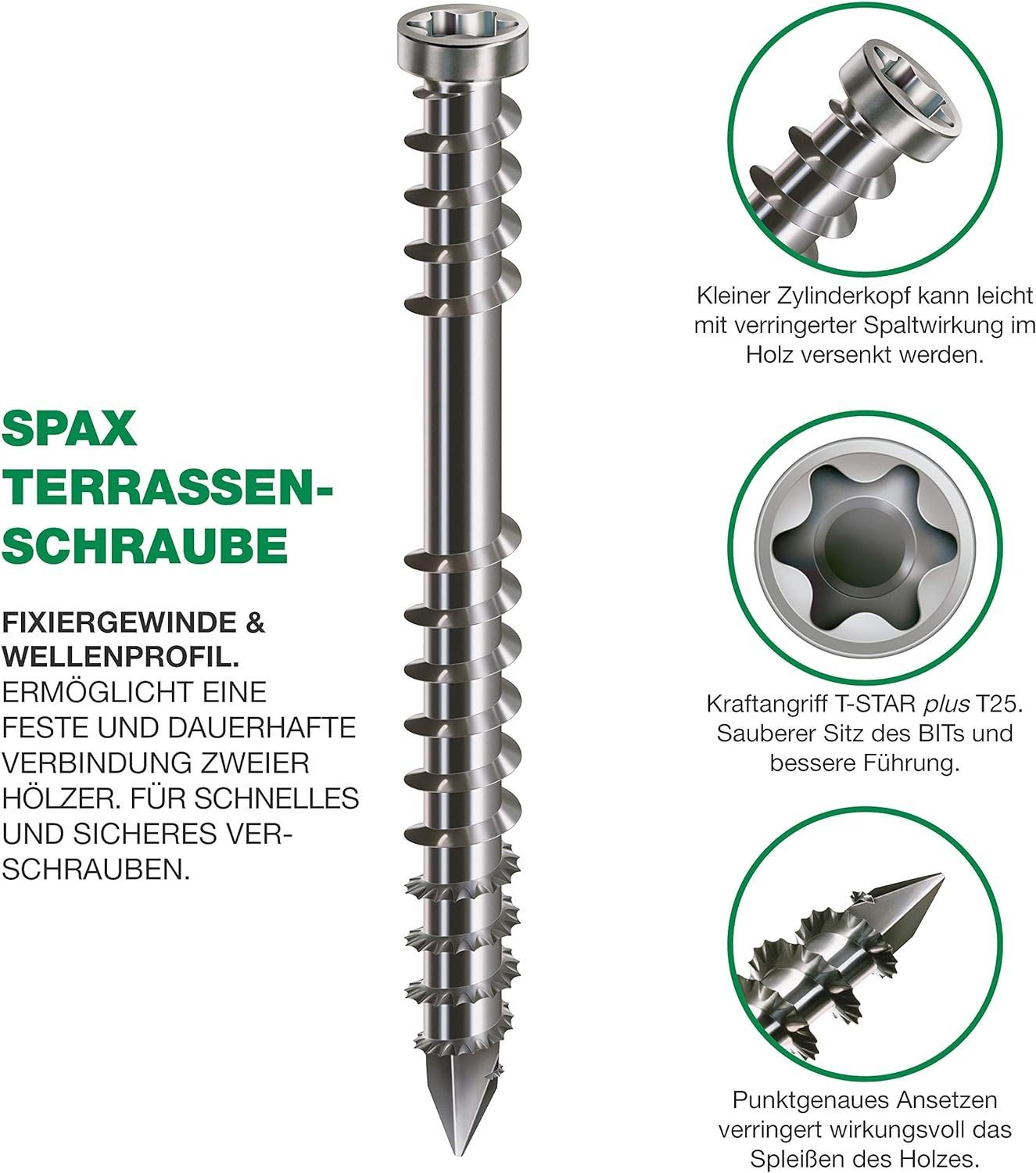 Die Terrassenschraube aus Edelstahl rostfrei A2 hat eine hohe Korrosionsbeständigkeit und eignet sich daher zur Anwendung im Außenbereich. Ein Fixiergewinde sorgt für eine sichere und dauerhafte Verbindung zweier Hölzer. Der Kraftangriff T-STAR plus sorgt zusammen mit dem passenden SPAX T-STAR plus Bit mit Führungszapfen für eine optimale Kraftübertragung. Der kleine Zylinderkopf kann leicht im Holz versenkt werden und bietet eine einwandfreie Optik. Durch das SPAX-typische Wellenprofil kann die Holzfaser leichter durchtrennt werden. Die CUT-Spitze ermöglicht ein punktgenaues Ansetzen und verringert durch ihre Bohrfunktion die Spleiß-Wirkung des Werkstoffes. Im perfekten Zusammenspiel ermöglichen diese Produkteigenschaften ein ermüdungsfreies Arbeiten sowie eine längere Akku-Lebensdauer.
