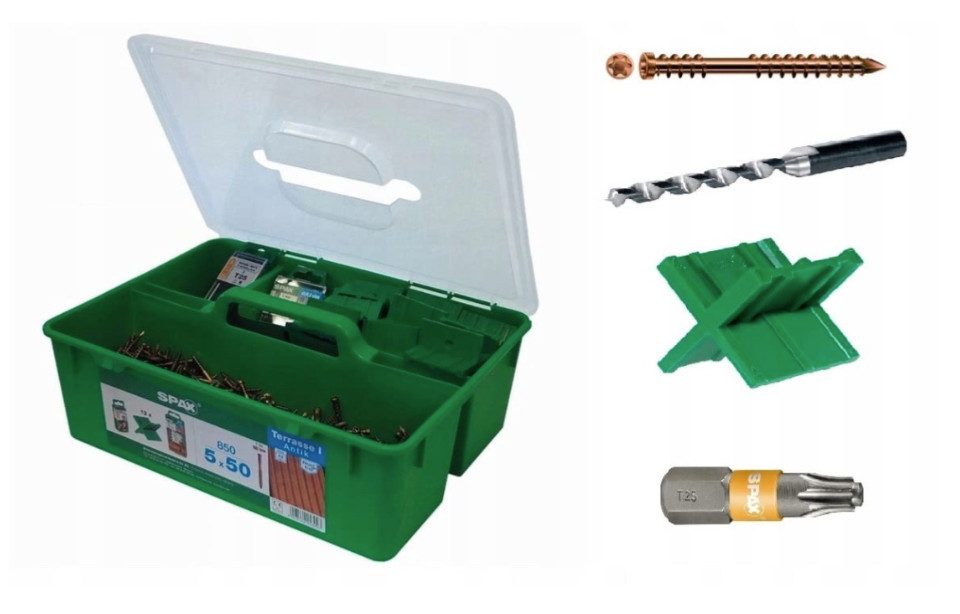 Spax-D Terrassenschrauben 5x50 + Bonus GreenBox bestehend aus: 850Stück 5x50 Antik A2 Spax Terrassenschraube Zylinderkopf 12 Stück Fugenlehren / Spacer 5 Stück SPAX Bits T25 1 Stück Stufenbohrer Anwendung: Holzterrassen im Freien. Das Anzugsgewinde garantiert ein zuverlässiges und dauerhaftes Anziehen der verschraubten Elemente. Minimiert das Knarren der Struktur. Der kleine zylindrische Kopf versinkt leicht im Holz und sorgt für eine makellose Optik. Schrauben aus Edelstahl A2 in der Farbe Altgold, speziell für die Installation von Terrassen aus exotischem Holz und allen Arten von Weichholz (sibirische/europäische Lärche, Fichte, Kiefer, Thermoholz).