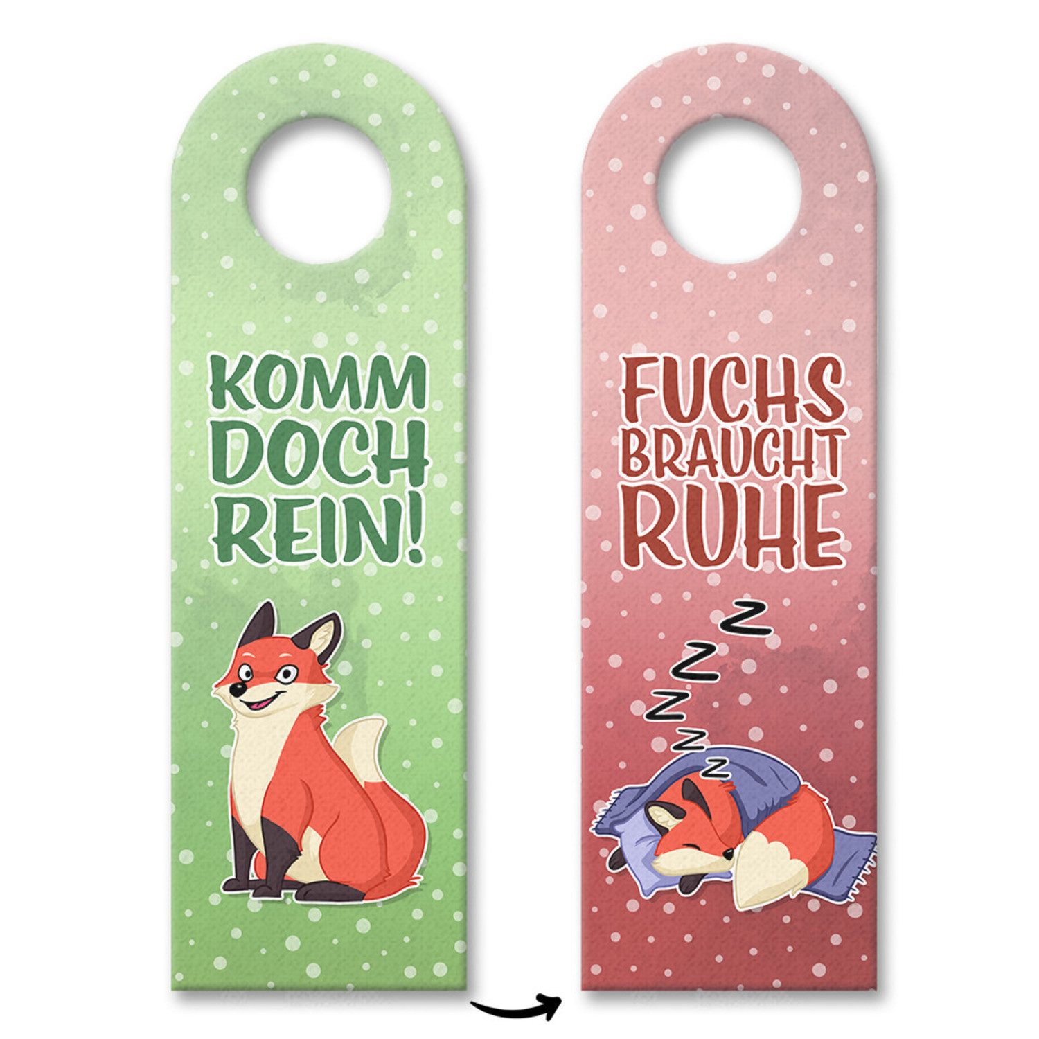 Der Türhänger zeigt zwei Füchse: Einer wach, einer schläft. Seiten sagen 'Komm rein' oder 'Brauche Ruhe', farblich in Grün und Rot.