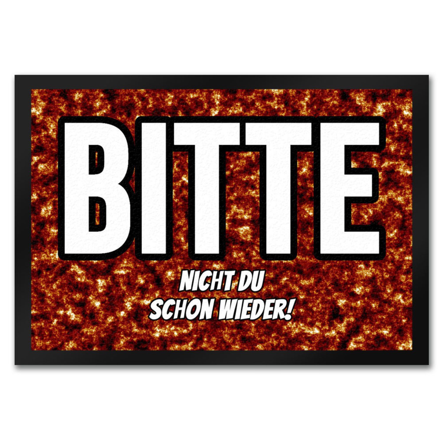 Die Türmatte hat einen Hintergrund in Flammen und trägt zudem die Aufschrift: Bitte nicht du schon wieder, wobei das Wort BITTE in extra großen Lettern geschrieben ist. Somit sieht dein Besuch sofort, wie dein Gemütszustand ist, sollte er an deiner Türe klingeln.