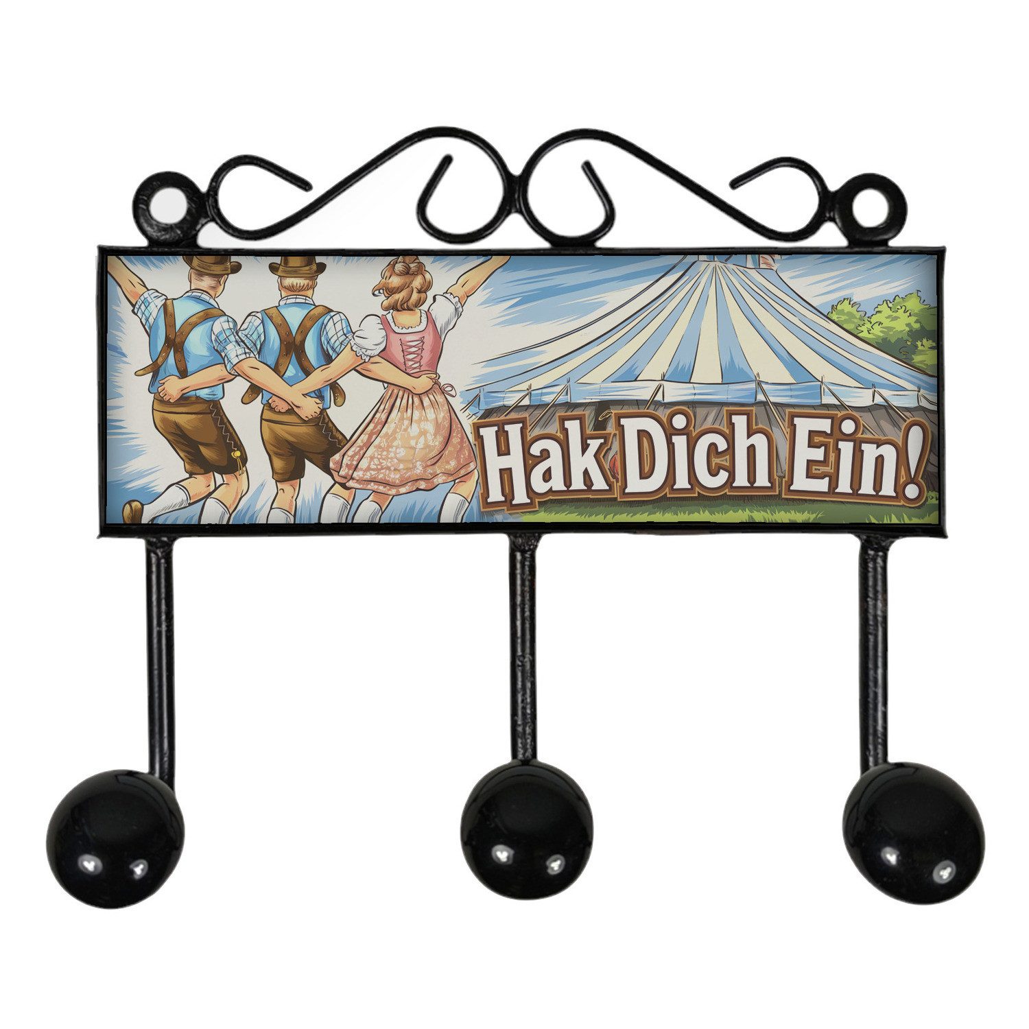 Diese Kleiderhakenleiste bezaubert mit einer humorvollen Illustration zweier Männer und Frauen in bayerischer Tracht, die Lederhosen und Dirndl tragen. Die Rückansicht zeigt die fröhlichen Gesellen im typischen Festzelt-Ambiente. Der Spruch 'Hak dich ein!' prangt in fetten Lettern und bringt Schwung in jede Wand. Ein Must-have für Trachtenfans!