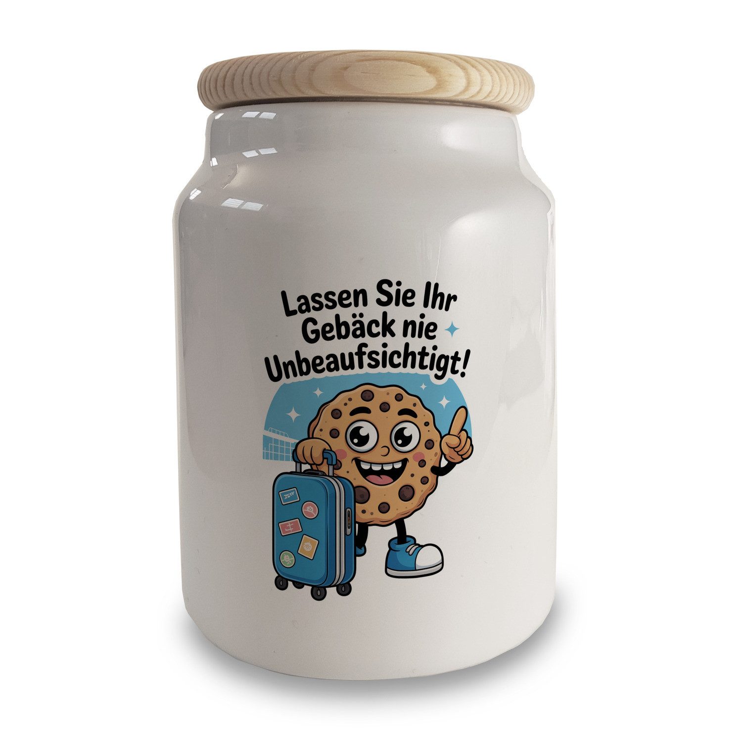 • Humorvolle Keksdose: Fröhlicher Keks mit Koffer im Flughafen-Stil, ausdrucksstarke Augen, leuchtend blauer Koffer, frecher Spruch: Lassen Sie Ihr Gebäck nie unbeaufsichtigt!