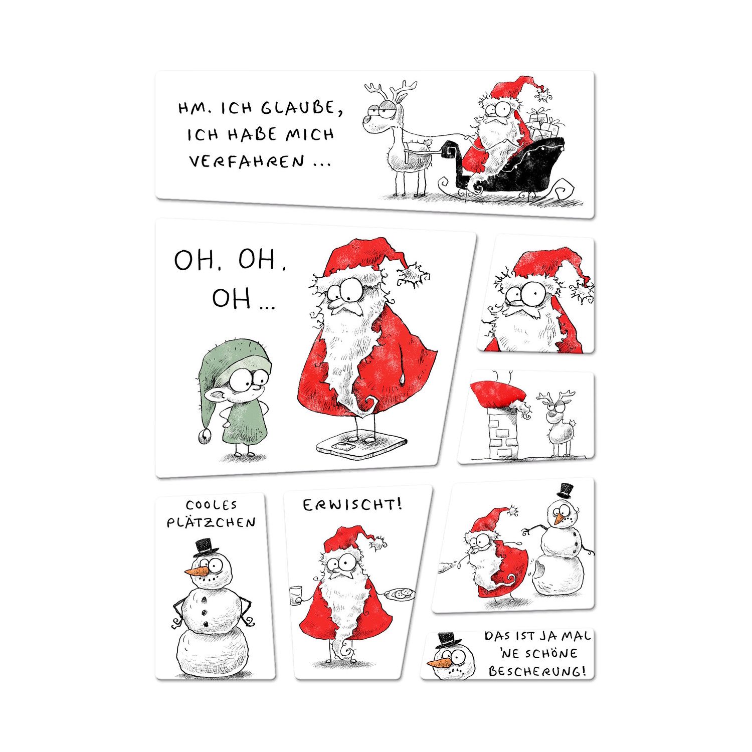Lustiges Magnet-Set im Cartoon-Stil mit Weihnachtsmannmotiv. Ideal, um Kühlschrank für Weihnachtsflair zu dekorieren.