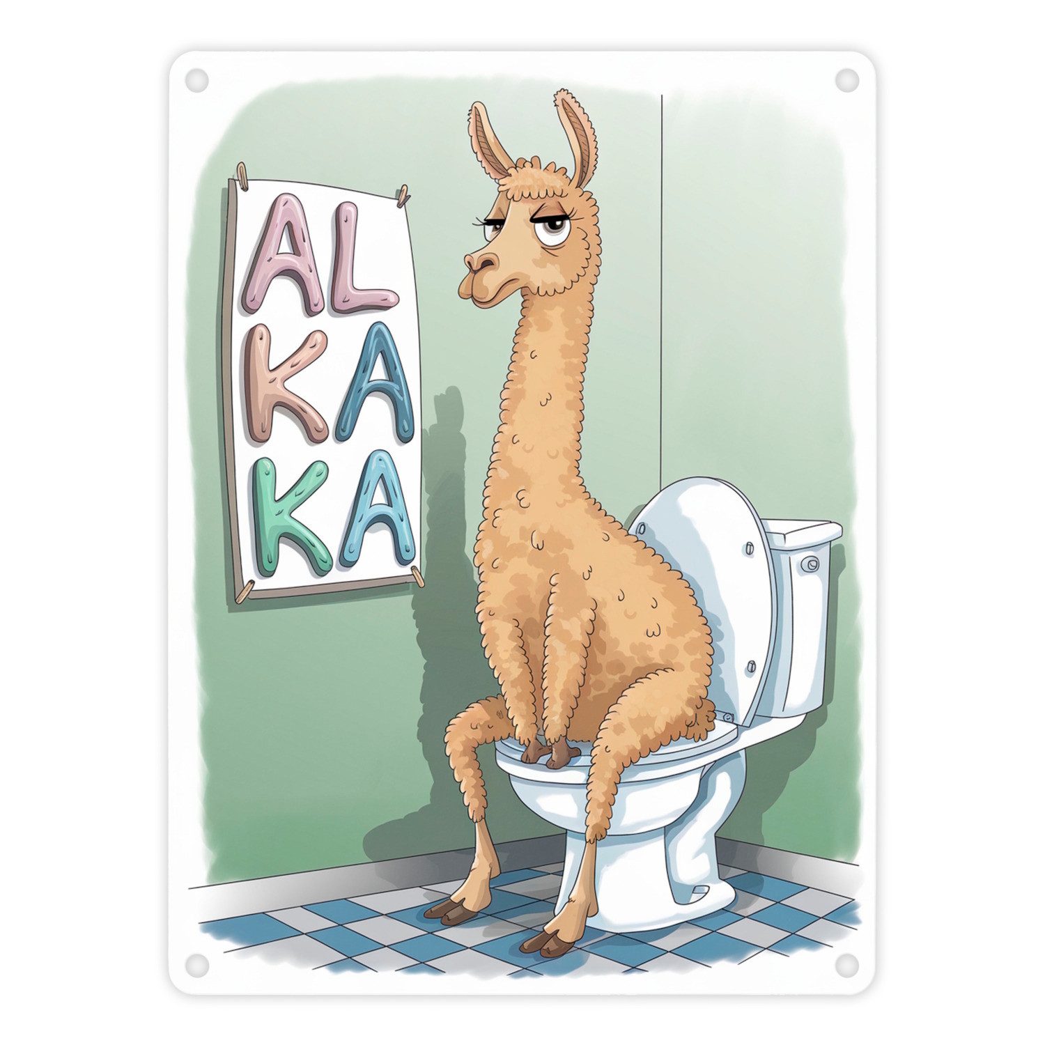 • Ein Metallschild zeigt ein Lama, das mit konzentriertem Ausdruck auf einer Toilette sitzt. Der Text ALKAKA in verrückten Buchstaben sorgt für Humor und belebt jeden Raum.