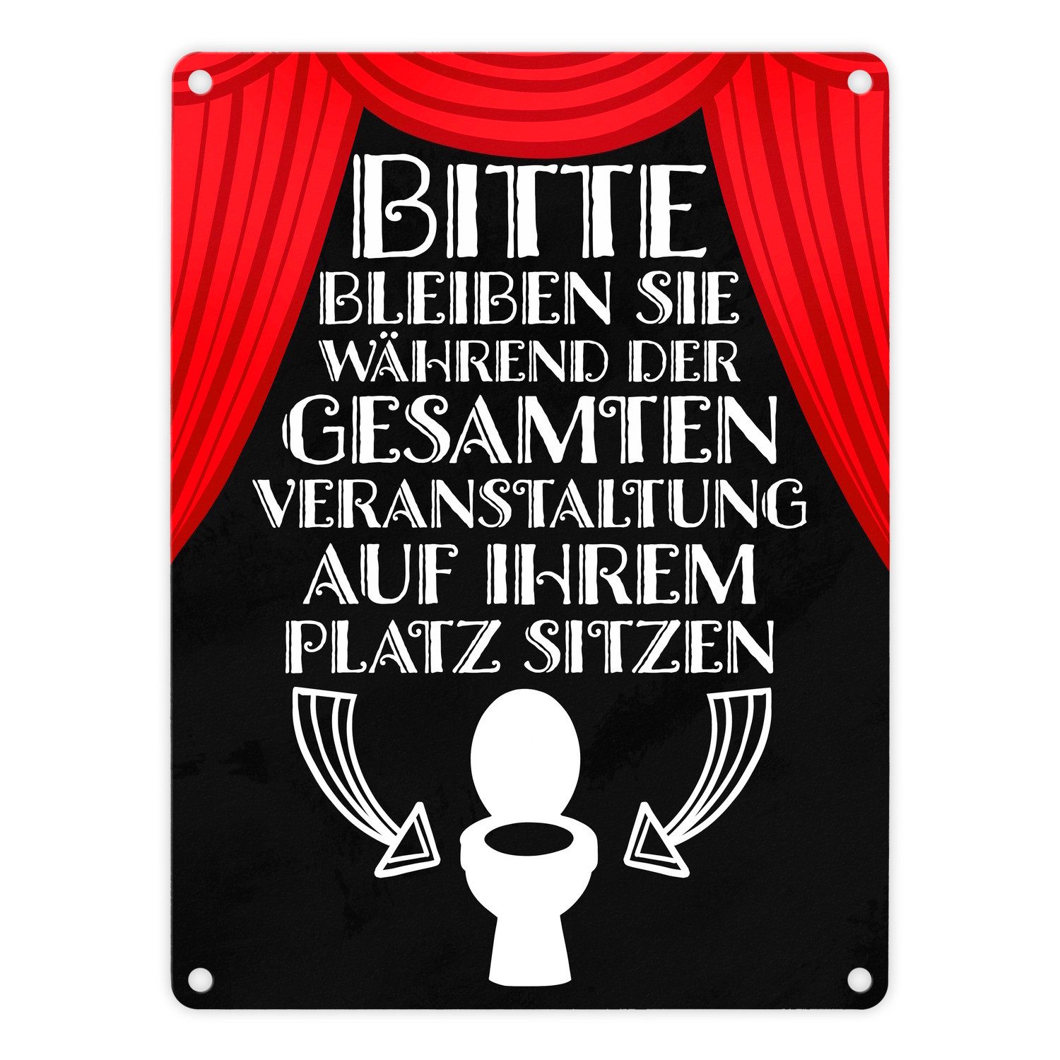 • Metallschild mit rotem Vorhangbild, 'Bleiben Sie sitzen' in Weiß, Pfeile zur Toilette.