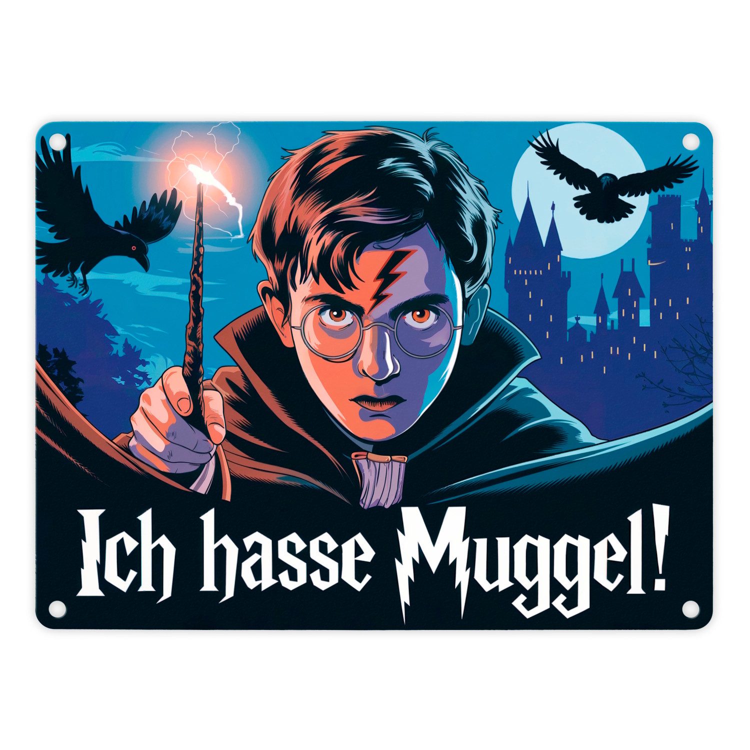 • Entdecke das Metallschild Grimmiger Zauberlehrling! Ein Teenager mit runden Brillen, blitzförmiger Narbe und Zauberstab, umgeben von Raben und Schloss im Hintergrund.