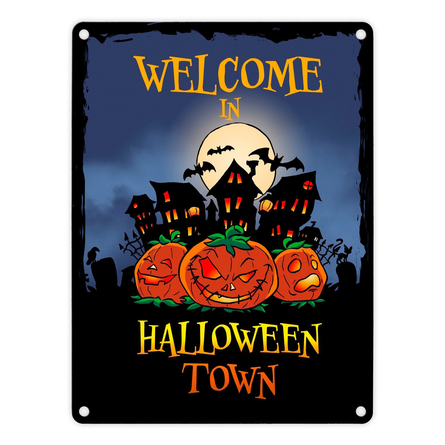 speecheese Metallschild Metallschild in 15x20 cm mit gruseligem Motiv und Spruch Welcome Town