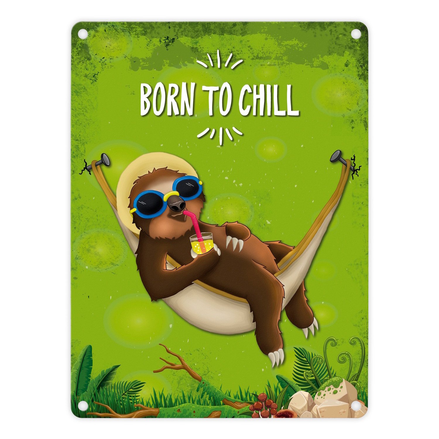 Entspannungspflicht! Das Metallschild Born to chill mit dem süßen Faultier in der Hängematte lädt zum Nichtstun ein. Aus glänzendem Aluminium (15x20cm) mit hochwertigem Druck - ideal für alle Vertikal-Entspanner und Deko-Genießer!