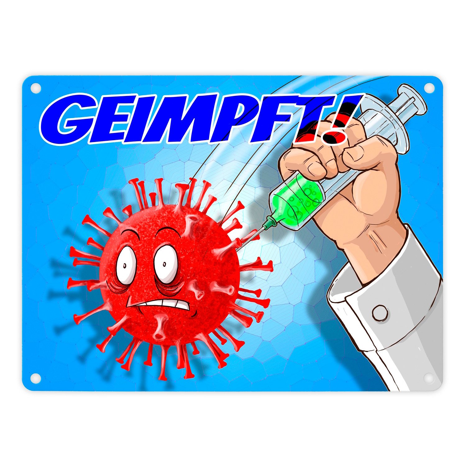 speecheese Metallschild Metallschild in 15x20 cm mit Virus und Spritzen Motiv Geimpft!