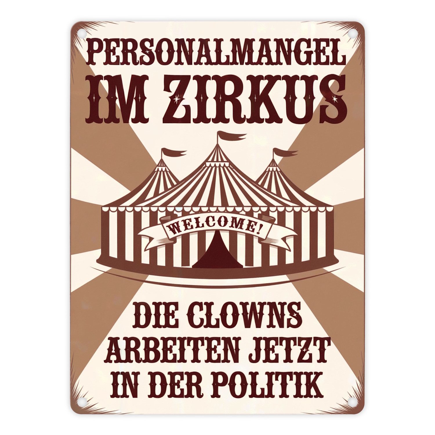 • Willkommen im Zirkus der Politik! Unser Vintage-Metallschild mit humorvollem Spruch und Zirkuszelt bringt Zirkus-Charme und Gesprächsstoff in Ihr Wohnzimmer.