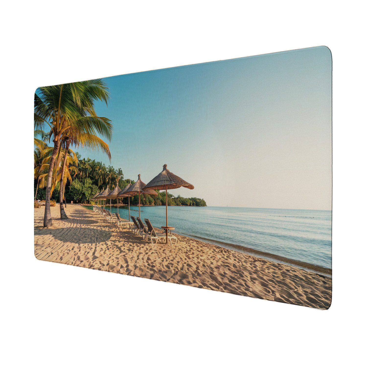 Bringen Sie das tropische Paradies direkt auf Ihren Schreibtisch! Unsere Schreibtischunterlage zeigt einen atemberaubenden Sandstrand mit Palmen, Liegestühlen und Sonnenschirmen. Perfekt für tägliche Mini-Urlaube!