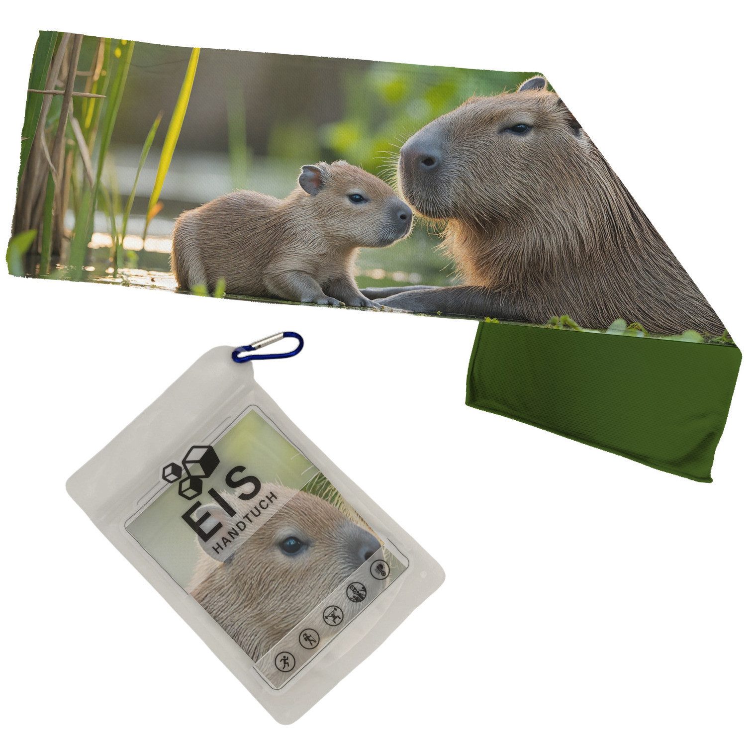 Das Eishandtuch zeigt eine Capybara-Mutter mit ihrem Baby in einer idyllischen Feuchtgebietslandschaft. Ein charmantes Motiv für jeden Tierliebhaber!