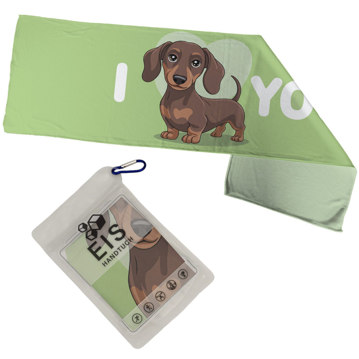 Eishandtuch mit charmantem Design: Cartoon-Dackel auf pastellgrünem Hintergrund. Lange Schnauze, ausdrucksvolle Augen und I love YOU!-Text mit Herzmotiv.