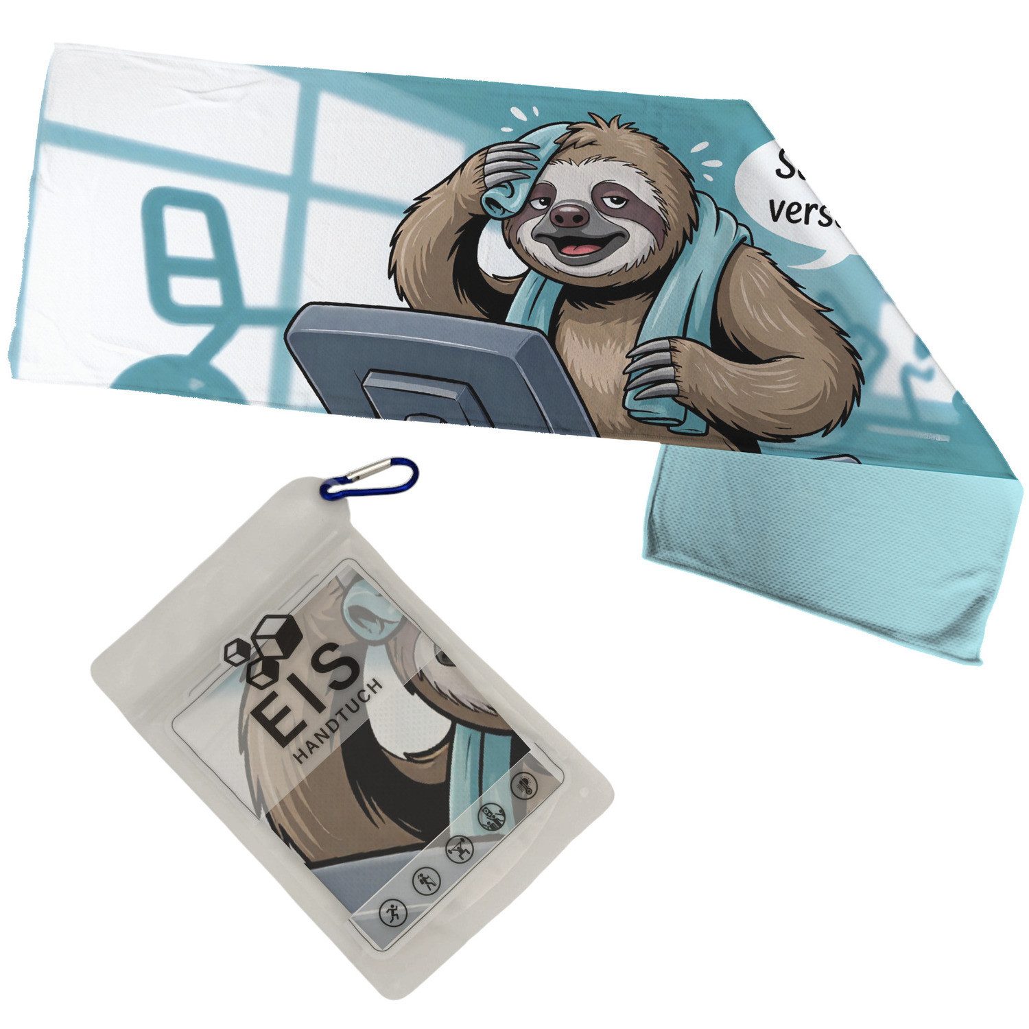Erleben Sie das ultimative Faultier-Erlebnis! Ein Eishandtuch zeigt ein witziges Faultier auf einem Laufband im Fitnessstudio mit dem Spruch Sorry, hab's verschwitzt!