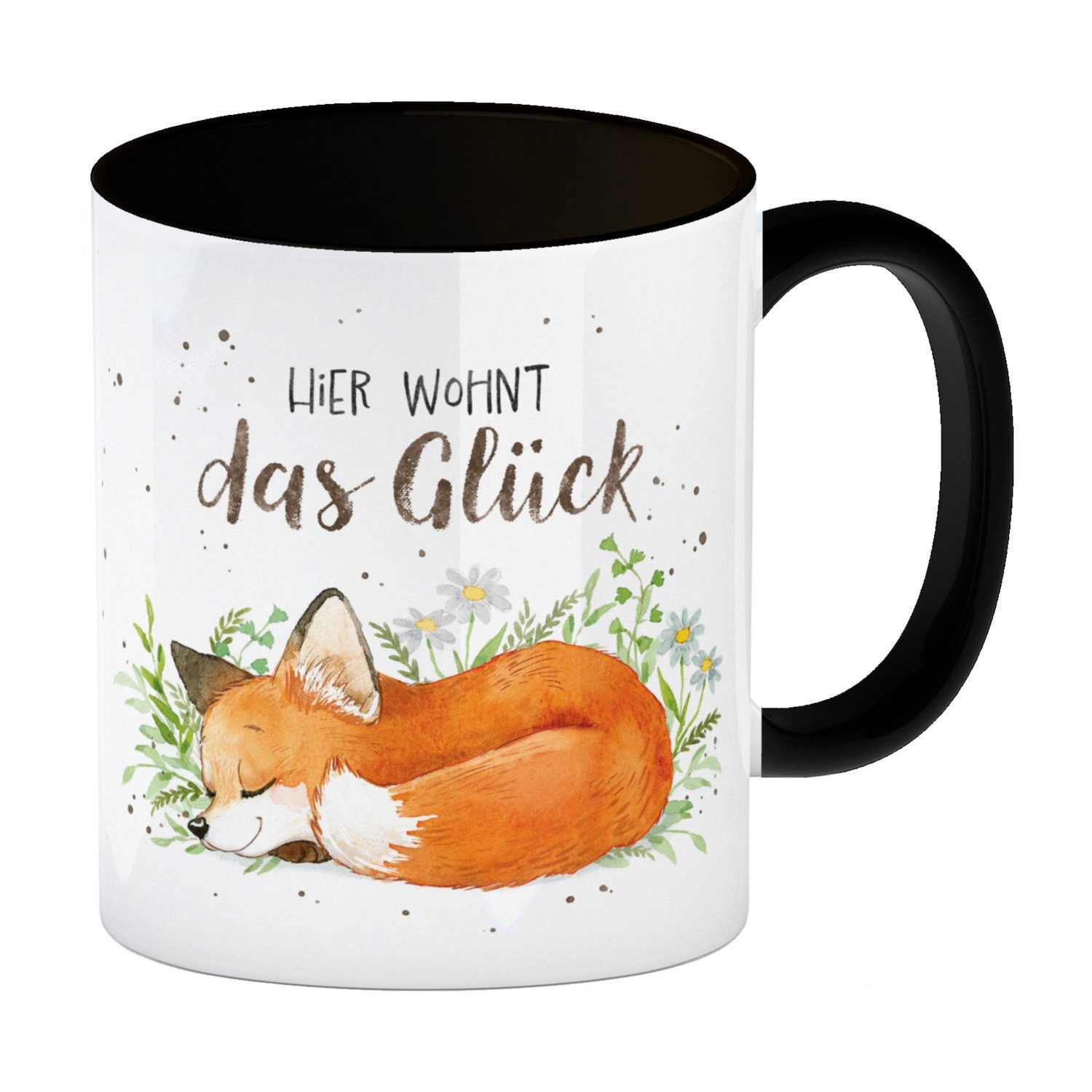 Lieferumfang: 1x Hier wohnt das Glück Kaffeebecher in schwarz mit Fuchs im Aquarell-Stil