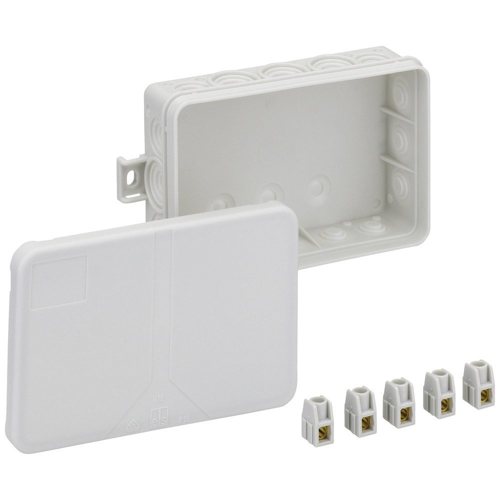 Verbindungsdose nach DIN EN 60670 (VDE 0606), 16 Einführungen, 3 Bodeneinführungen, komplett mit Lochwerkzeug und Verschlussstopfen, mit außenliegenden Befestigungsstellen, grau, mit Schraubklemme, 5-polig 2,5qmm