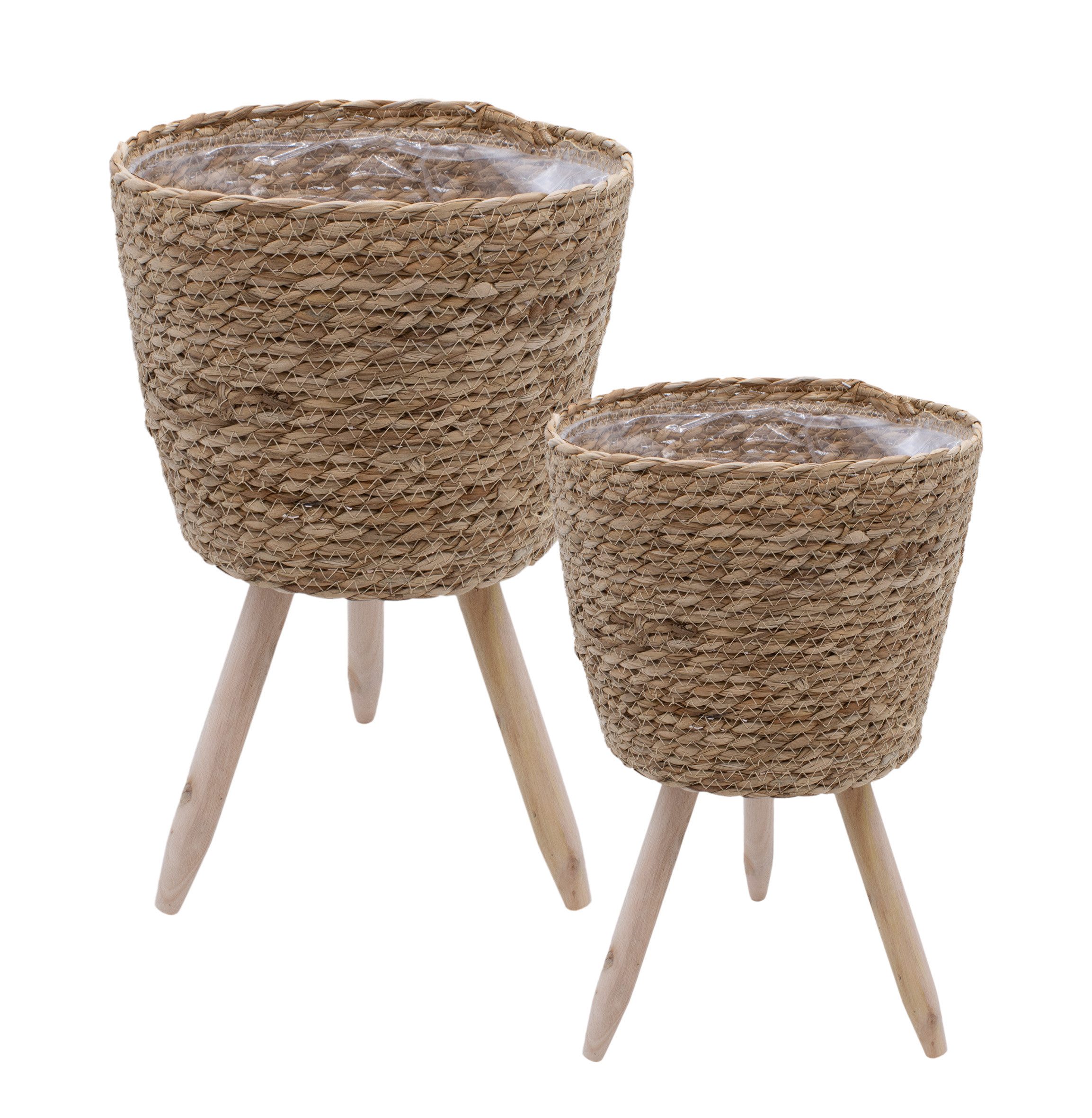 Blumenständer aus Stroh innen mit Folie 2er Set - 26 / 23 cm - Rattan Pflanzenständer mit 3 Holz Beinen