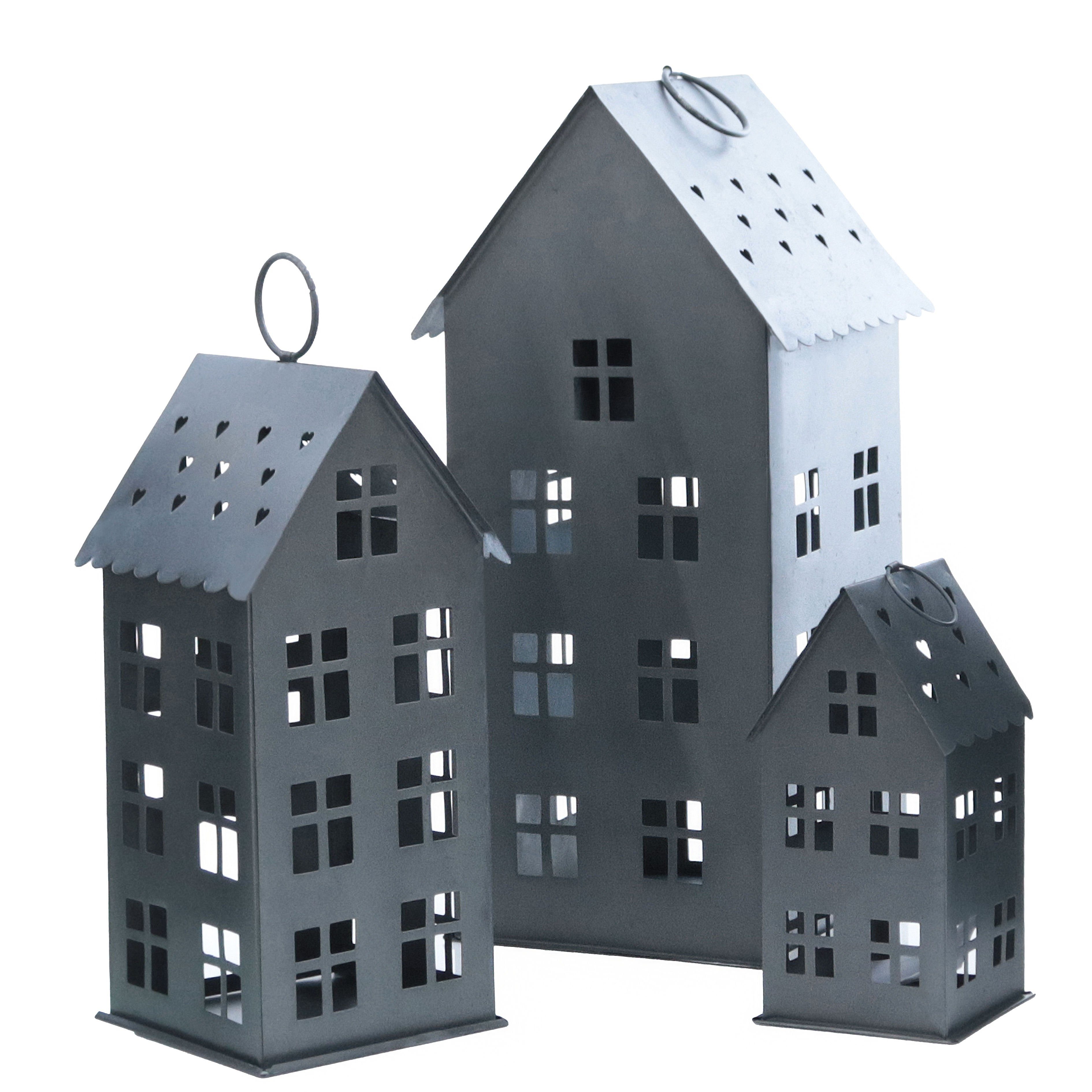 Windlicht in Hausform aus Metall in dunkelgrau zum Aufhängen - 3er Set je 1x 43 / 31 / 20 cm Höhe